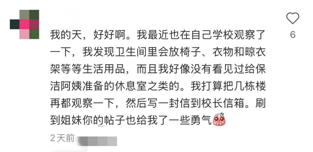 记者随后向后勤管理办公室核实,办公室主任张老师表示,之后学校会根据每栋楼的实际情况安排休息室,考虑在相邻区域专设一处空间供保洁人员使用。