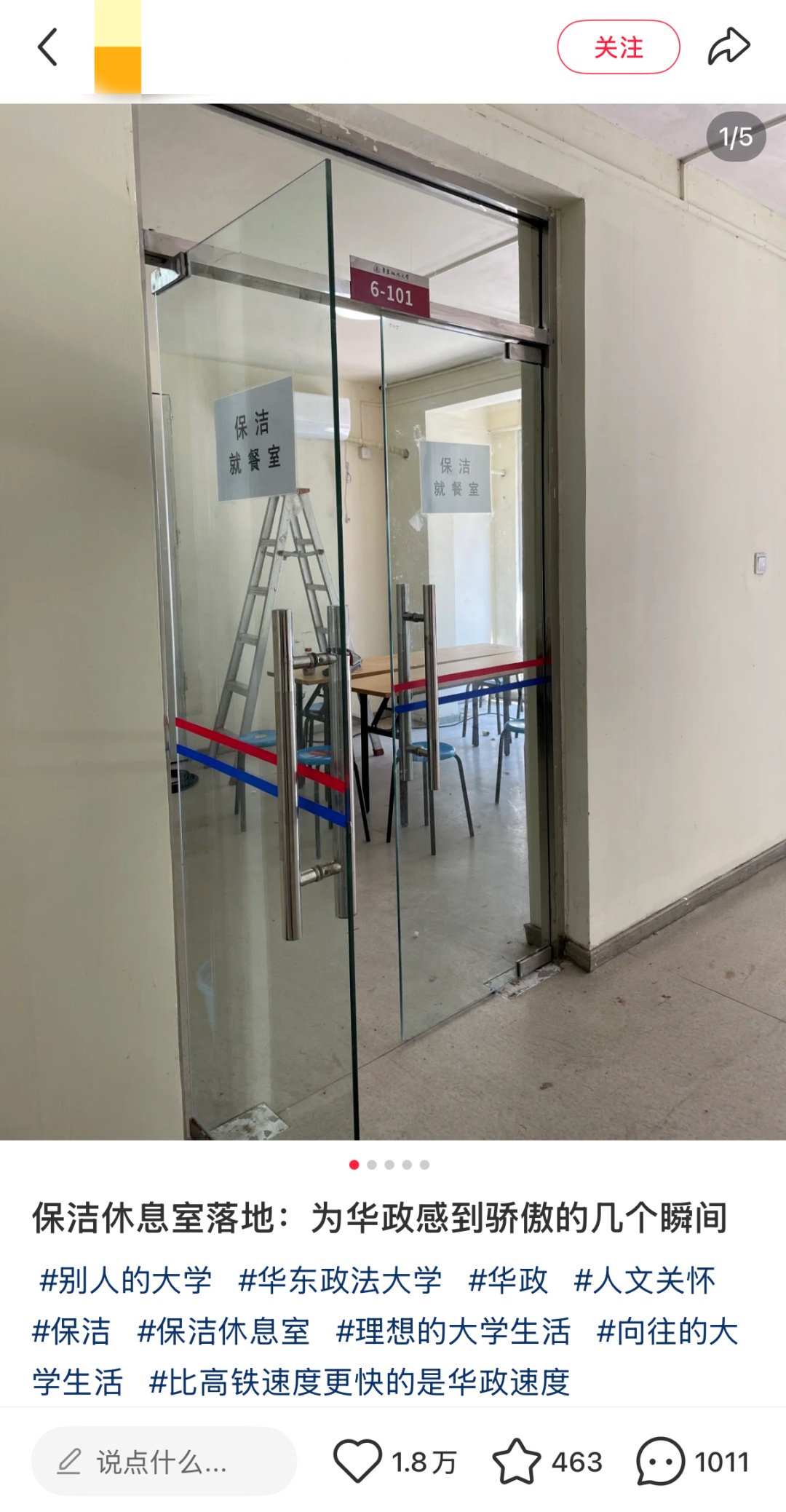 3月起,学校接到来自不同专业不同年级的学生通过电话、公众号、校长信箱等渠道提供的建议,随后又重新开始启动休息室计划。此次学校安排的就餐休息室选址在华东政法大学五期宿舍六号楼下。室内30平方米,可容纳20人就餐,配备有微波炉、空调、冰箱、沙发、桌椅、净水器。对此,保洁阿姨们纷纷笑着表示感谢学生对她们的关心。