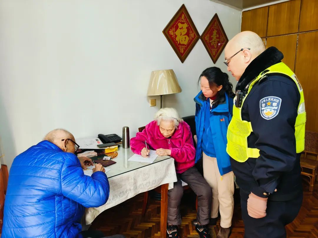 两位老人在漕泾一村居住二十多年,户口却一直在外区。如今,即将迎来百岁的他们希望将户口迁入小区,在了解老人的心愿后,老龄干部联系社区民警,一起上门办理户口委托事项。