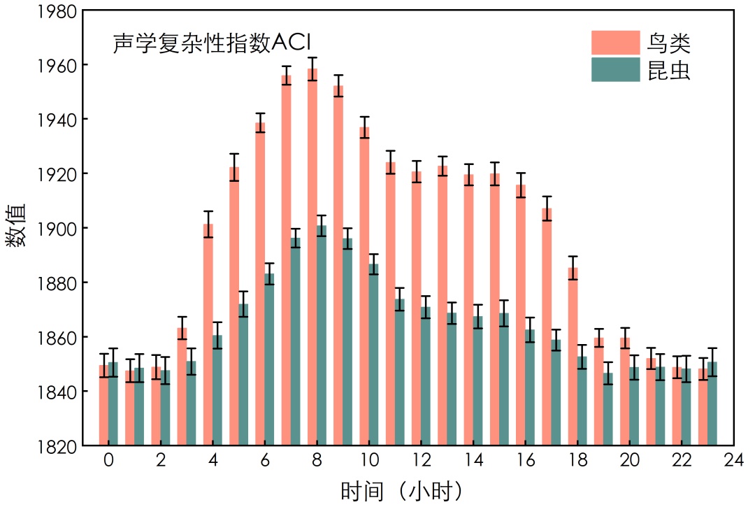麻雀 大山雀 鹊鸲 上海常见的鸟类(郑运祥 摄影) 市中心:中山公园奏响“四季交响曲” 春 气温渐渐回暖,清晨的公园里,白头鹎的清脆鸣叫与蜂类的嗡嗡声交织,仿佛一场“自然晨会”。 夏 蝉鸣与雨声合奏,鸟类在晨昏的活跃度达到顶峰,生物声学指数在全年最高。 秋 候鸟迁徙,鸟儿声音渐弱,虫鸣逐渐成了主场。深夜里,蟋蟀的振翅声为公园增添几分清凉与诗意。 冬 人为噪音“霸屏”,交通声盖过了稀疏的鸟鸣,但偶尔也能听到麻雀的短促啁啾。 中山公园声景日变化与季变化 近郊森林:金海湿地公园上演“双峰模式” 金海湿地公园里的自然协奏曲藏着独特的节奏。清晨6点和傍晚4点,鸟鸣声会形成两个高峰,这与鸟类“晨练”和“晚归”的集体鸣唱有关。 夏季,湿地蛙鸣加入合奏,丰富了声音元素,使得生物声学指数甚至超过了同期的中山公园。 金海湿地公园声景“双峰模式” 远郊森林:崇明林间开启“夜间音乐会” 崇明岛的声景以自然声音为主。夏季夜晚,昆虫尤为活跃,昆虫的振翅声与鹭鸟的低鸣声交织,形成独特的“月半小夜曲”。 有趣的是,崇明林地鸟类和昆虫活跃度全天均衡,白天“哒哒”的啄木声、傍晚的群鸟归巢声与晚风中的虫鸣,共同谱写着大自然的和谐韵律。 崇明生态片林声景日变化 纺织娘 日本条螽 云斑金蟋 素色似织螽 上海常见的鸣虫(郑运祥 摄影) 从市中心到远郊,我们发现自然声音越丰富的区域,往往人工噪声较少,鸟类和昆虫鸣声多样性越丰富,合奏声音也越舒缓。人工噪音较高的区域,鸟类会通过“提高嗓门”或改变鸣叫频率来适应环境,以此应对噪声负面影响,维持种群的繁衍能力。 听见未来:让城市与自然“共鸣” 树木在夜晚悄悄生长,动物用鸣声谱写生命乐章。这些自然的细节在提醒我们,森林不仅能被看见,也可以被聆听。 “世界赠予我虫鸣,也赠予我雷霆……” 亲爱的朋友,你有多久没有留心这些自然声音了? “停一停,等一等,别匆匆。” 适时放慢脚步,来公园林地“充电”、享受美景吧。同时,也别忽视了耳边的鸟啼虫鸣,这些来自大自然的白噪音,能帮助我们深度放松、疗愈身心! 森林之美,生生不息。森林赠予我们的,皆是生命的礼赞。 让我们从聆听开始,守护城市森林里的“声音宝藏”,为下一代留下更生动的自然乐章。
