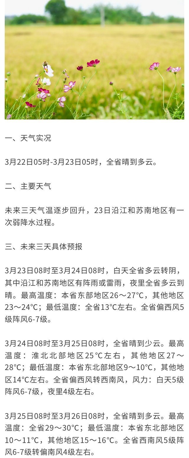 【未来三天气温逐步回升,23日沿江和苏南地区有一次弱降水过程】3月23日08时至3月24日08时,白天全省多云转阴,其中沿江和苏南地区有阵雨或雷雨,夜里全省多云到晴。最高温度:本省东部地区26~27℃,其他地区23~24℃;最低温度:全省13℃左右。全省偏西风5级阵风6-7级。 (@江苏气象)