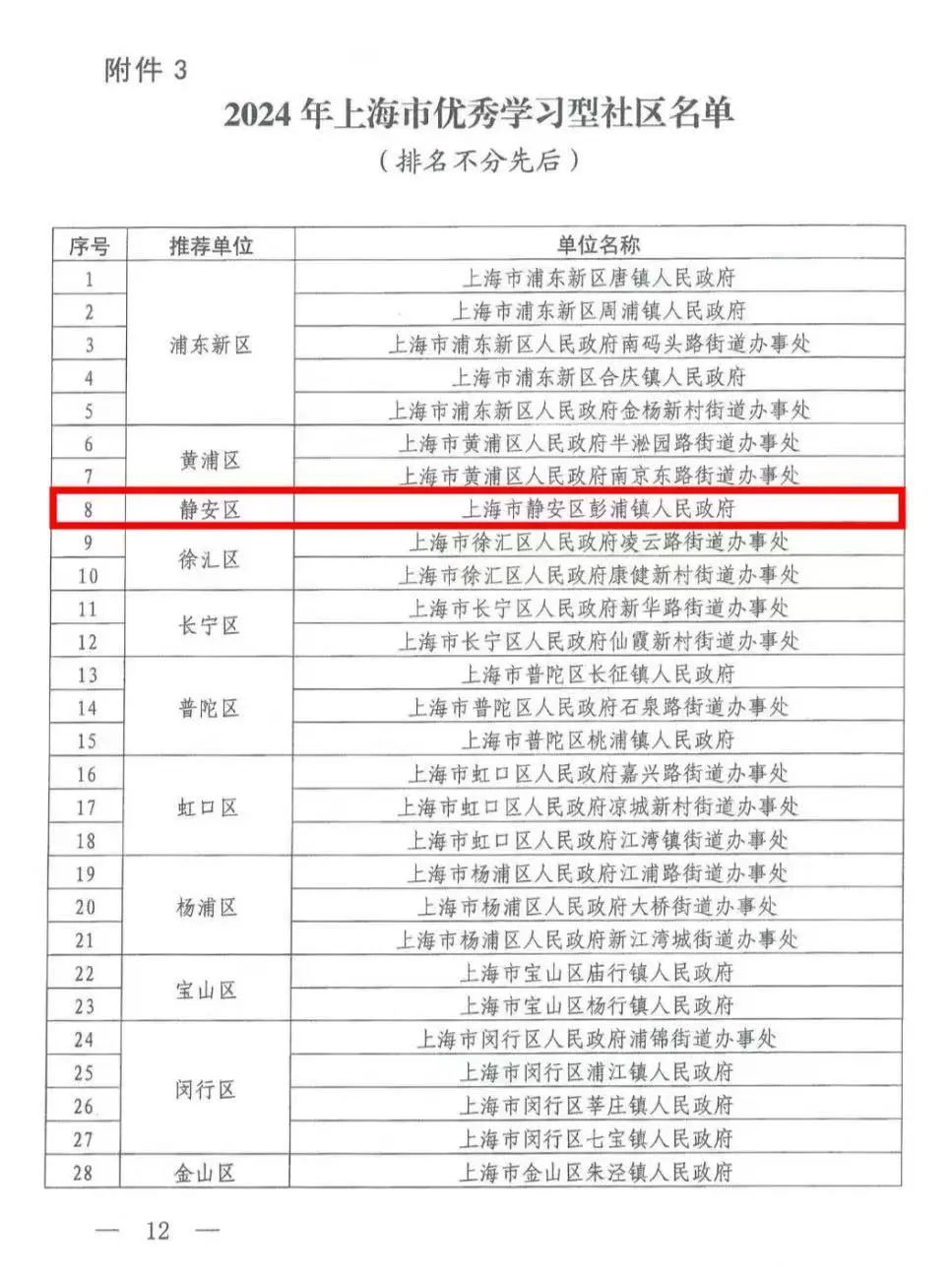 近日,上海市学习型社会建设与终身教育促进委员会办公室公布了2024年上海市优秀学习型组织名单,其中,静安区彭浦镇获评“2024年上海市优秀学习型社区”。