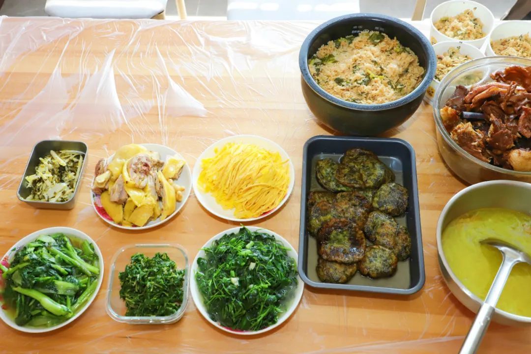 朱阿姨顺手又做了草头,灶头猛火快炒,加入蒜叶,瞬间激发出草头的鲜嫩,叶片如翡翠般透亮。满满一桌“春日宴”,除了春菜,还有小朋友爱吃的炒了糖色的芥菜塌饼,自己摊的蛋皮,红烧鹅肉、雪菜春笋,让人食欲大增。