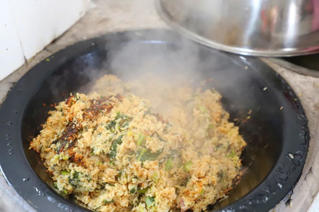老灶烧柴,待铁锅烧至青烟微起,将肥瘦相间的咸肉片煸炒至变色,加入切成段的菜心翻炒,再倒入已提前浸泡半小时的大米,最后混入“灵魂”酱油,加盖。静待二十分钟,肉香酱香混着青蔬鲜甜的灶头菜饭便大功告成,米粒吸饱了油脂与菜汁,变得晶莹油亮。假如爱吃锅巴,那就再多烧一会儿,焦香锅巴“咔嚓”作响,是令人怀念的儿时味道。