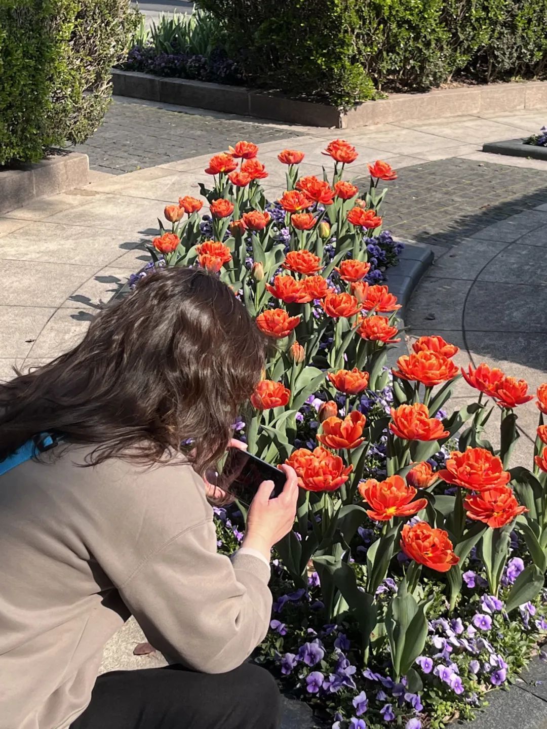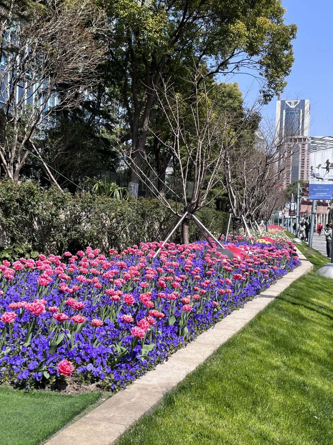 各色郁金香交错种植在延安中路嘉里中心门前绿地,橙红、粉色的重瓣如少女层层叠叠的裙摆,“幸福一代”红白色的单瓣在阳光的照耀下散发着绸缎般的光泽,日常少见品种的“神秘火焰”热烈耀眼……