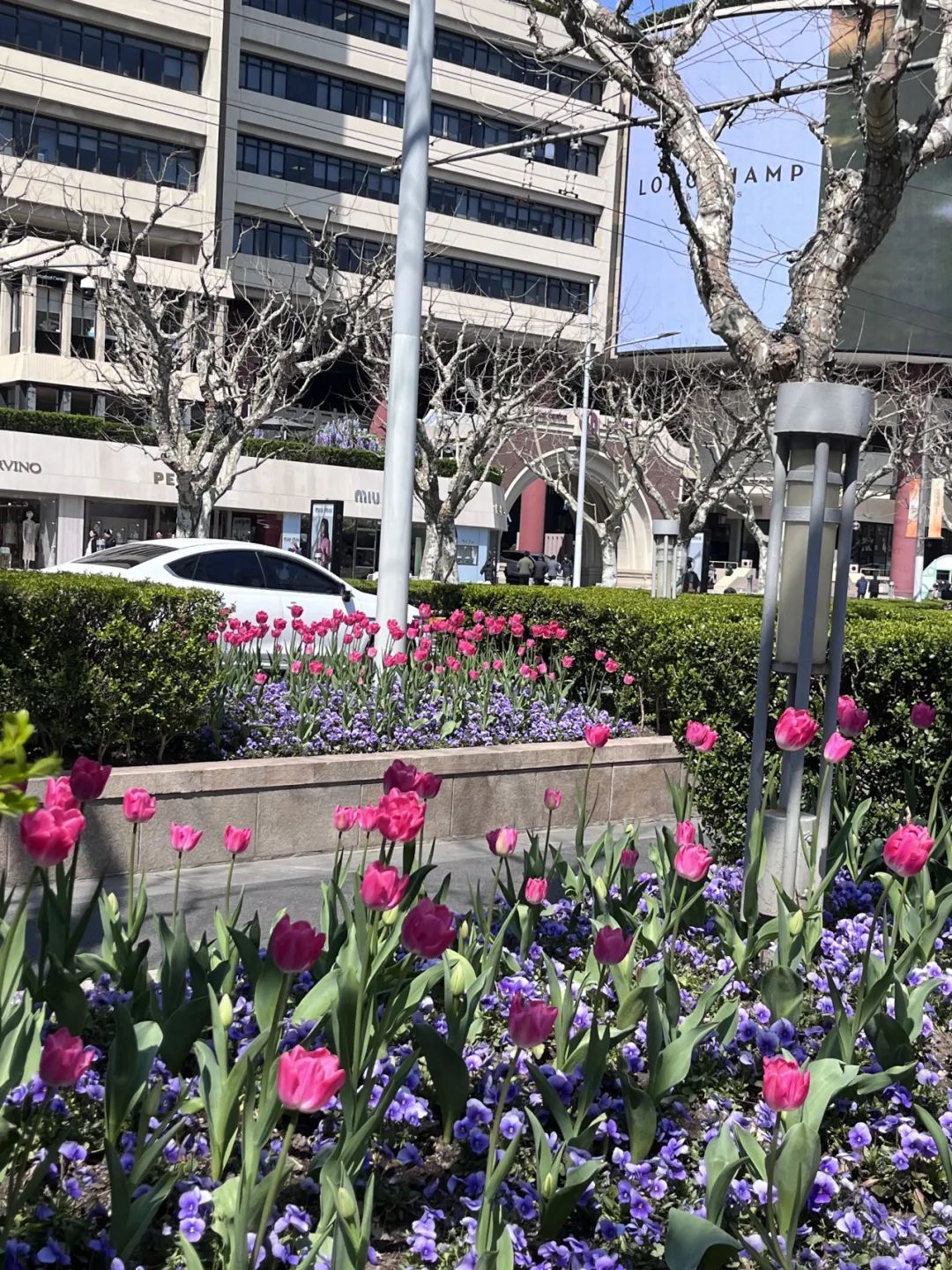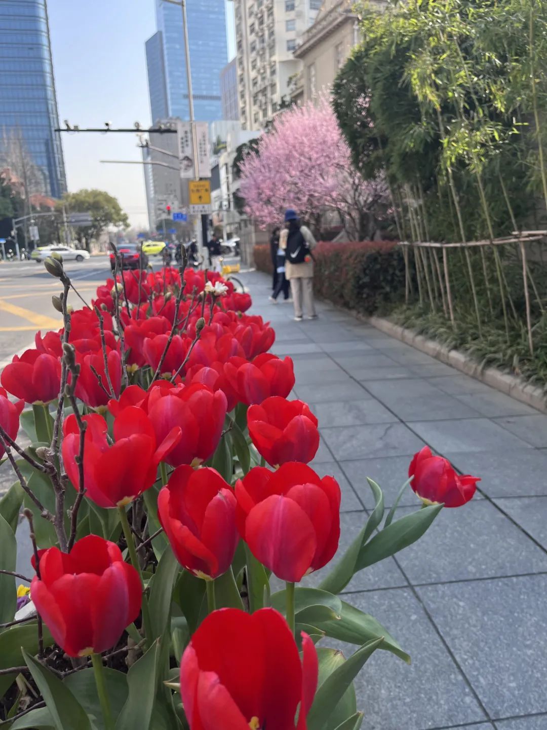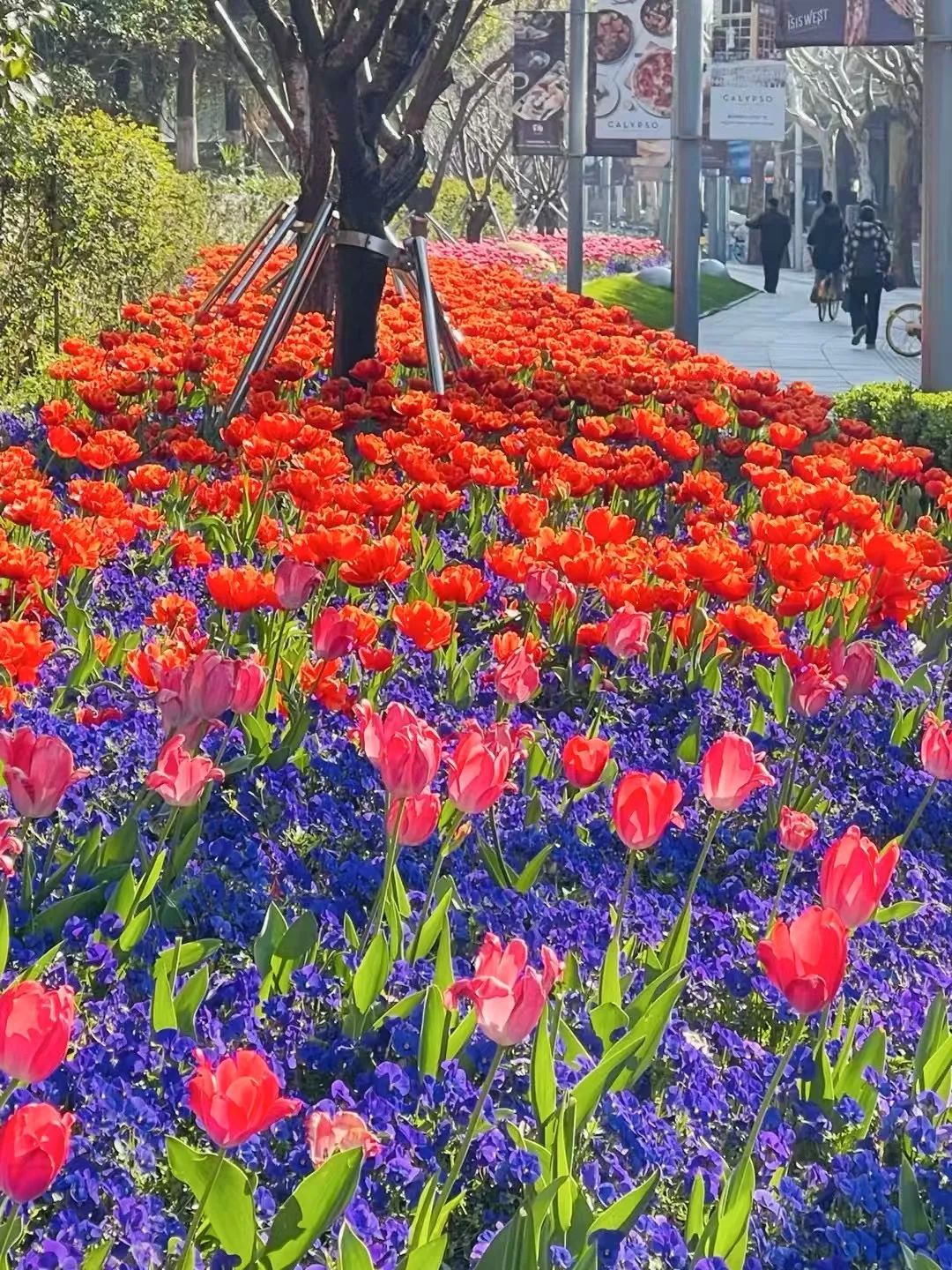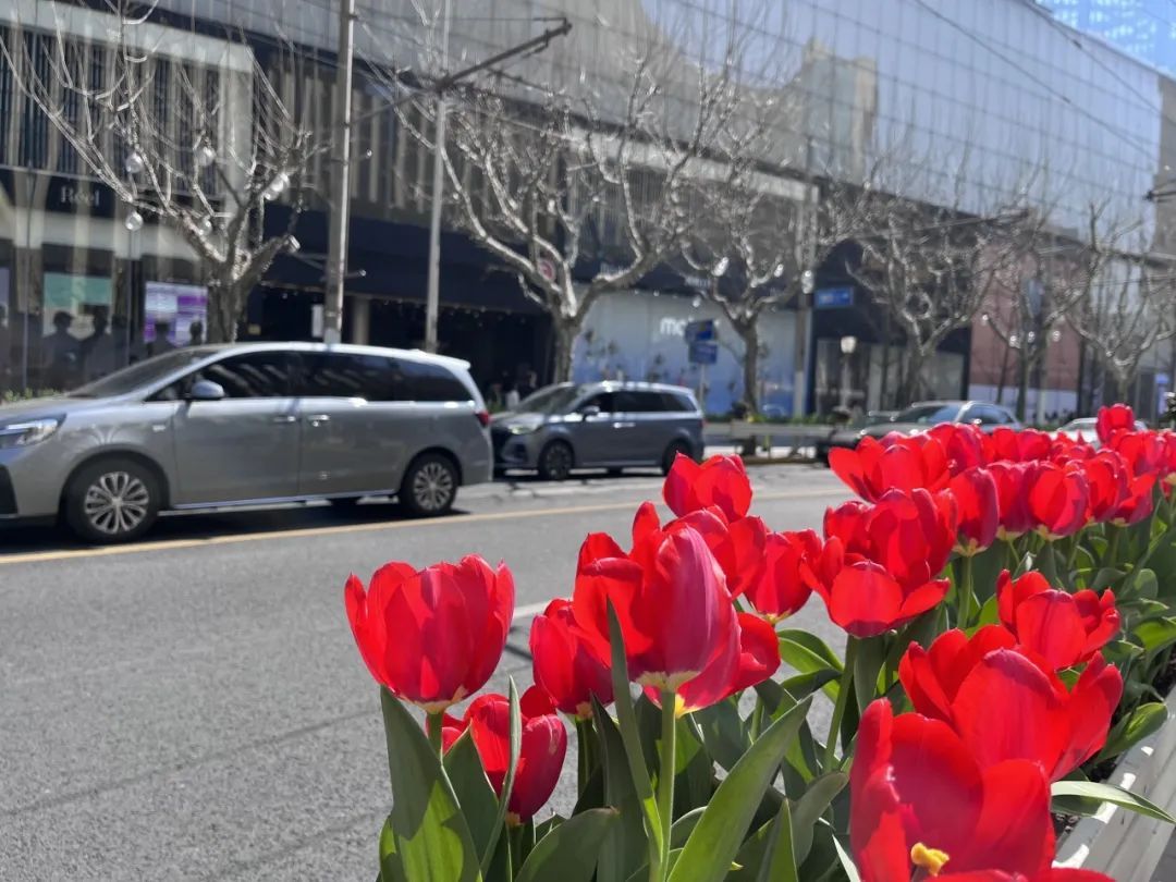 久光百货和芮欧百货之间,车水马龙倒映出街边郁金香的迷人身姿,城市街景与自然春色交融为一体。