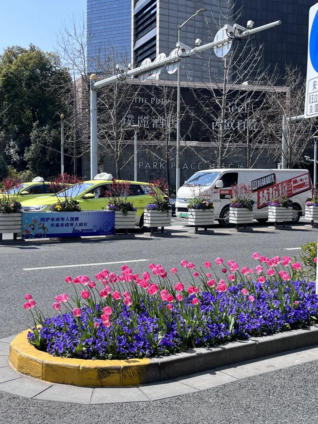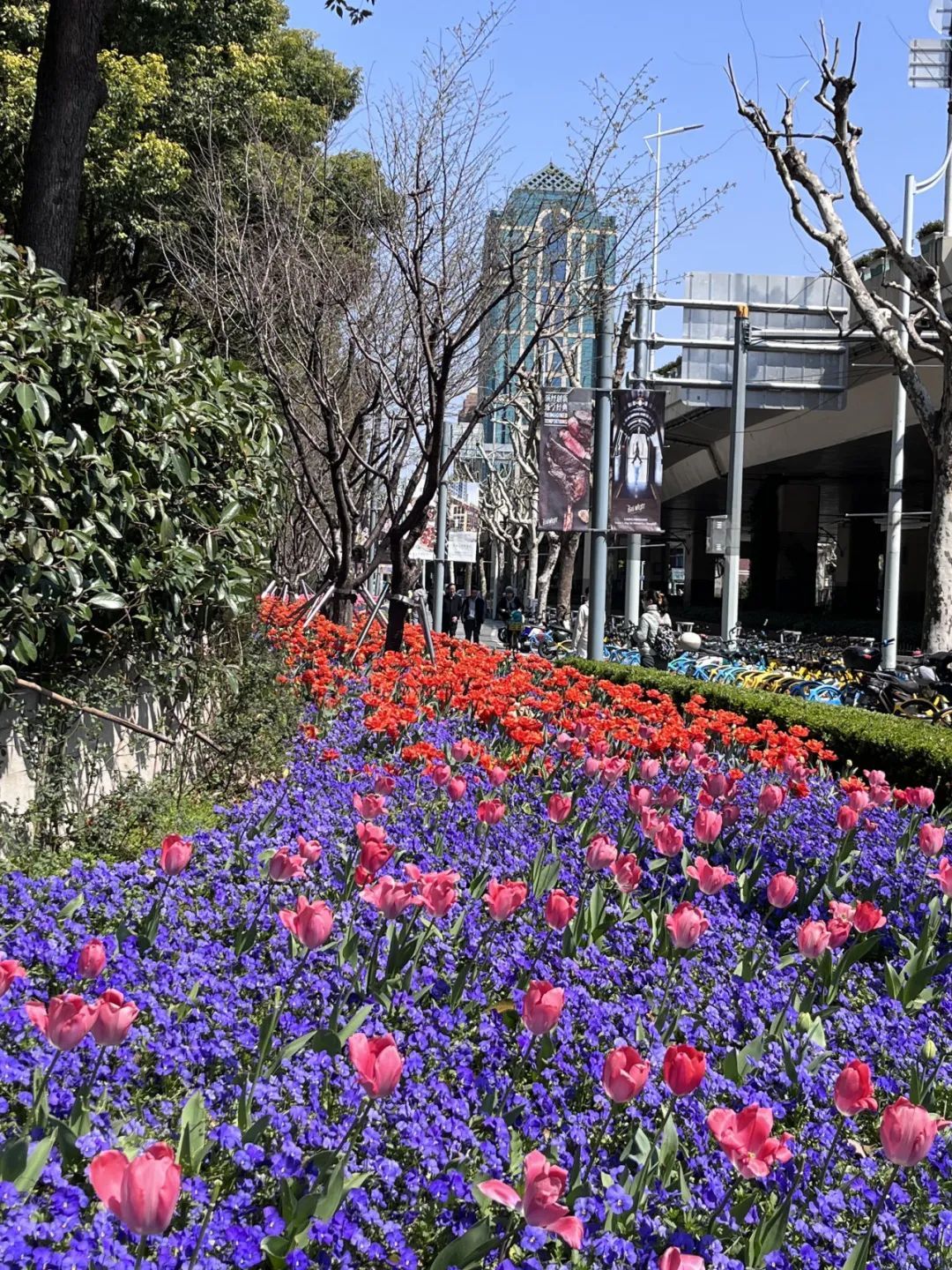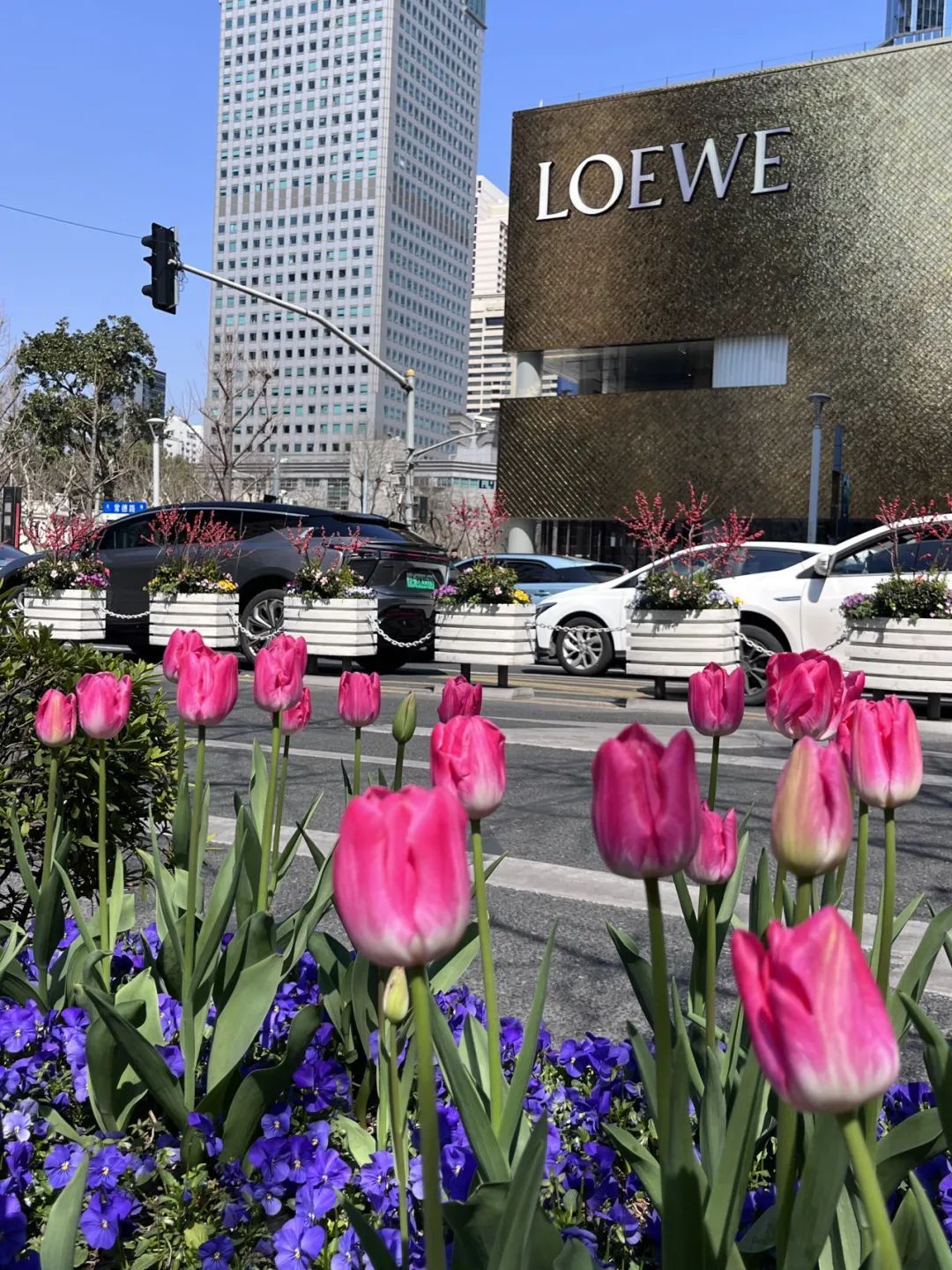 久光百货和芮欧百货之间,车水马龙倒映出街边郁金香的迷人身姿,城市街景与自然春色交融为一体。
