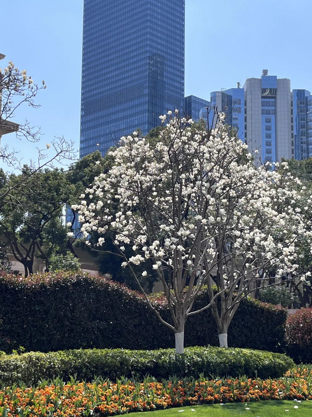 行至友谊会堂,庄严的建筑前白玉兰开得绚烂,低处的郁金香含苞待放。