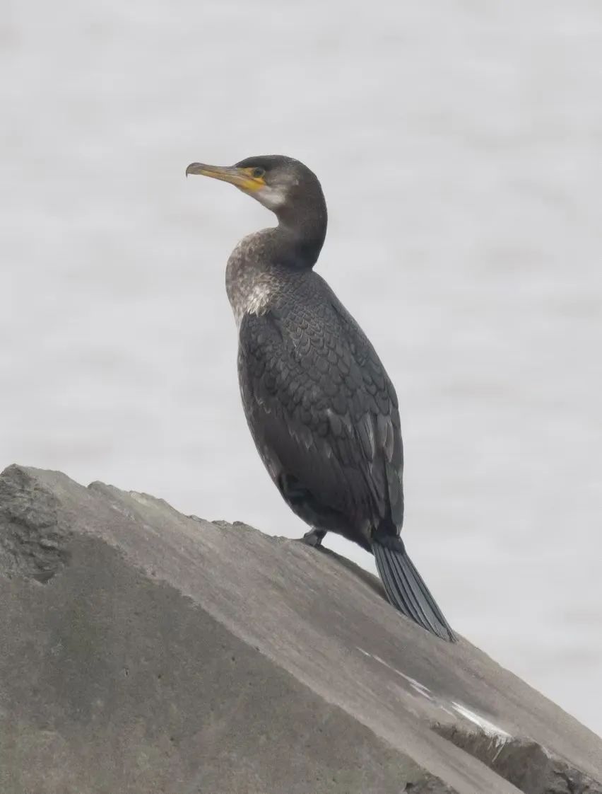 下沙东北侧导堤上斑嘴鸭群旁的暗绿背鸬鹚