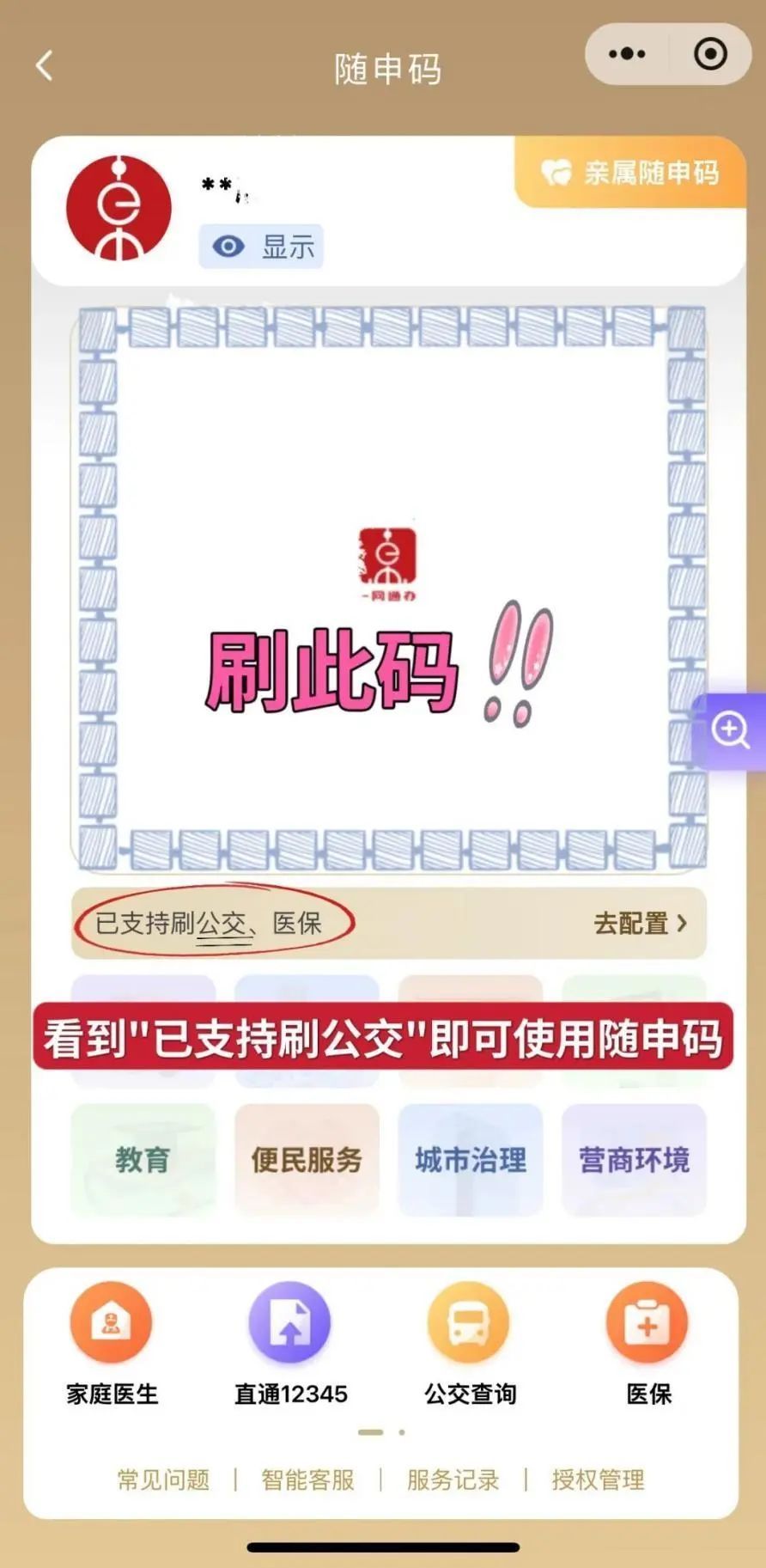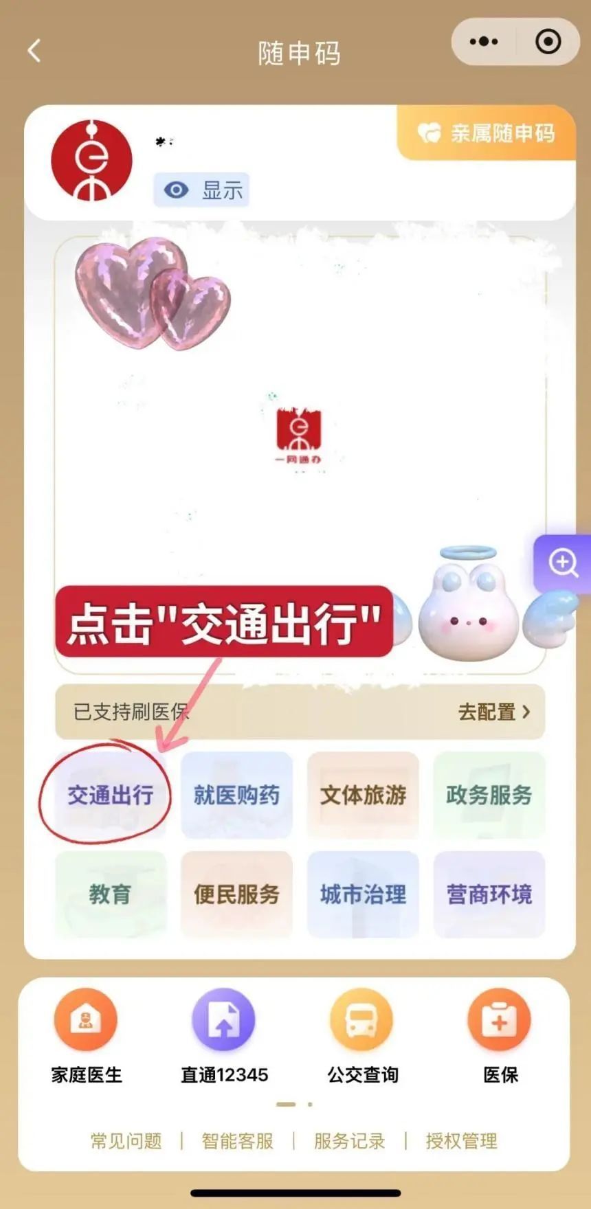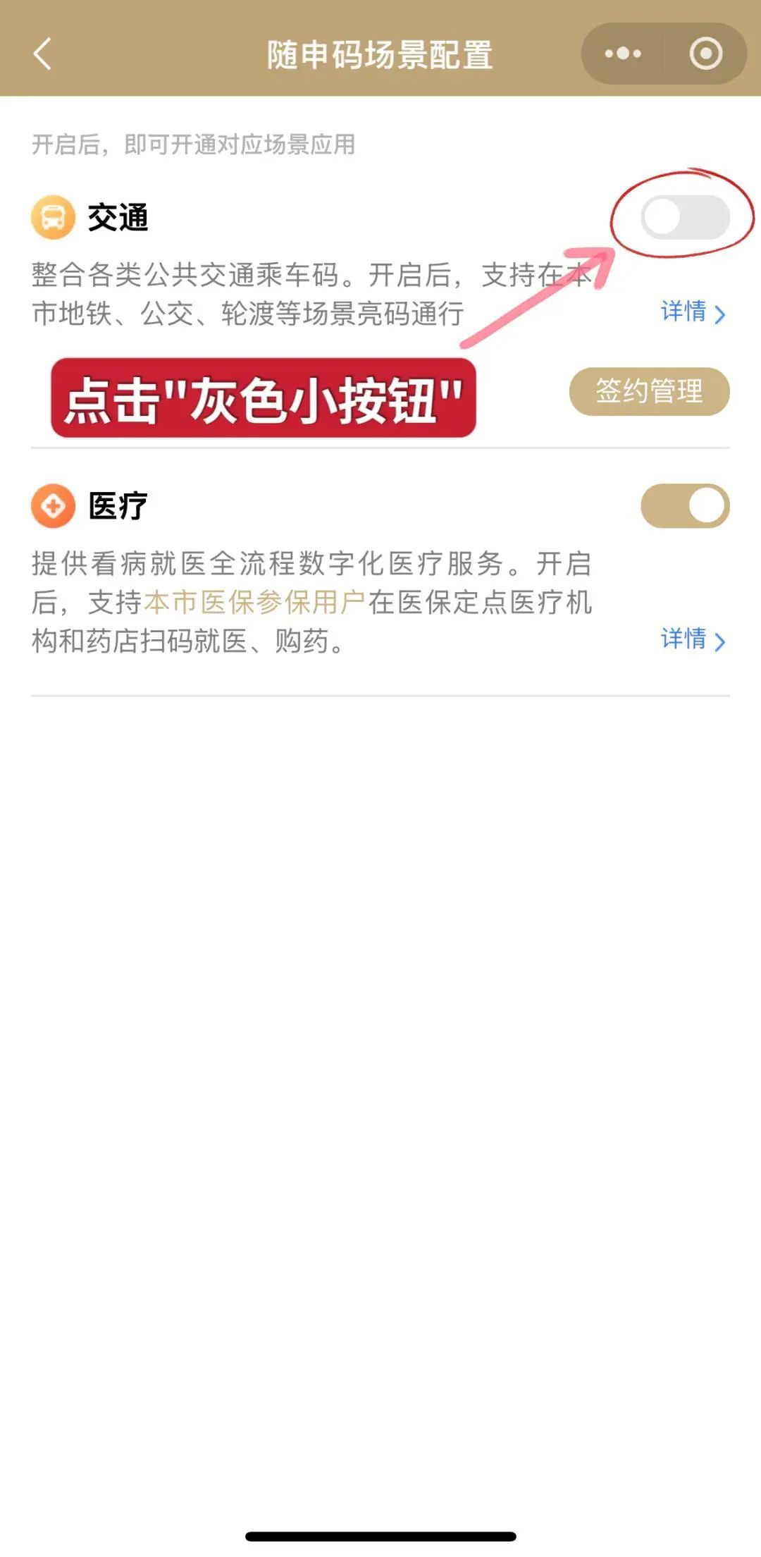 在交通出行板块内,点击“随申码”交通出行右侧的“小按钮”,打开后会自动跳转至随申码场景配置,点击右侧“小按钮”。