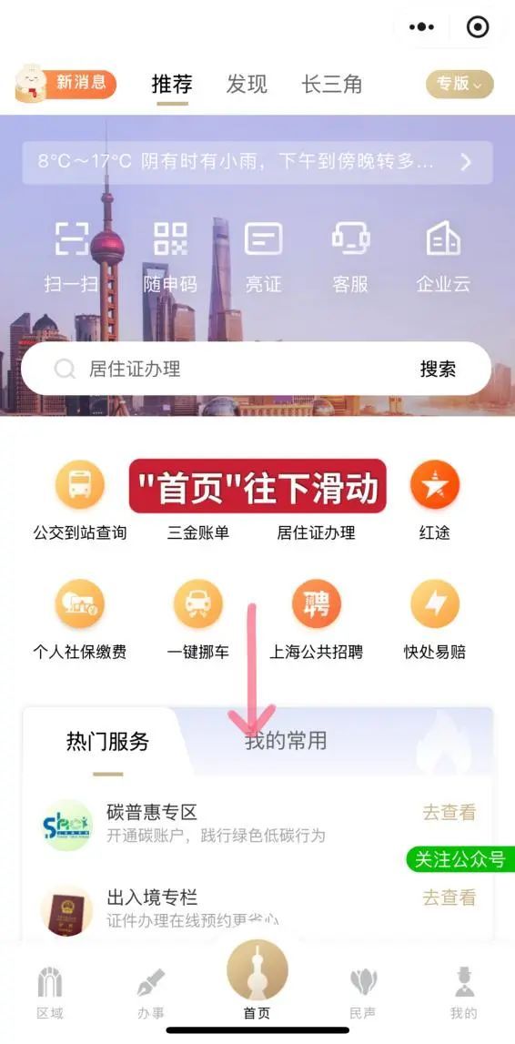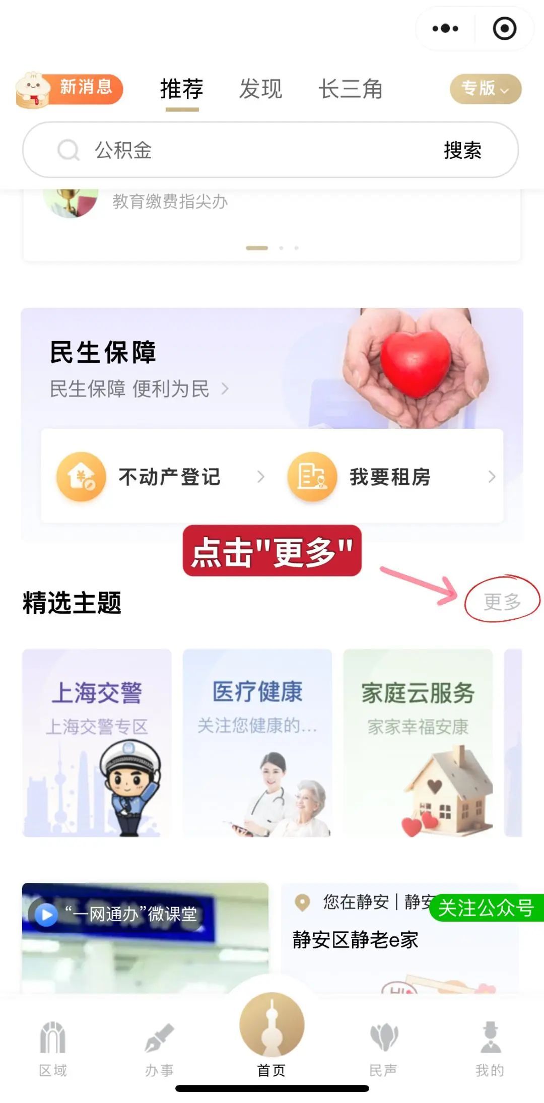打开“随申办市民云”(APP、微信小程序、支付宝小程序),“首页”往下滑动,找到“精选主题——更多”点击跳转。