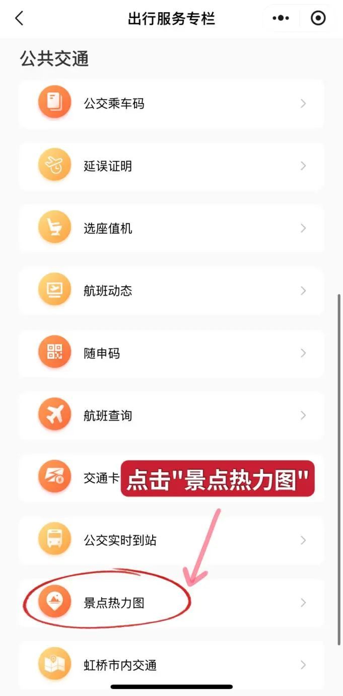 在“出行服务专栏”页面往下滑动,在“公共交通”板块倒数第二排,点击“景点热力图”页面跳转即可。