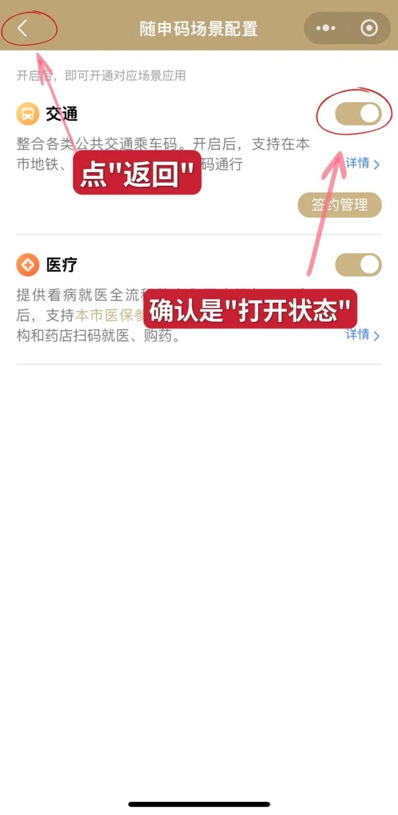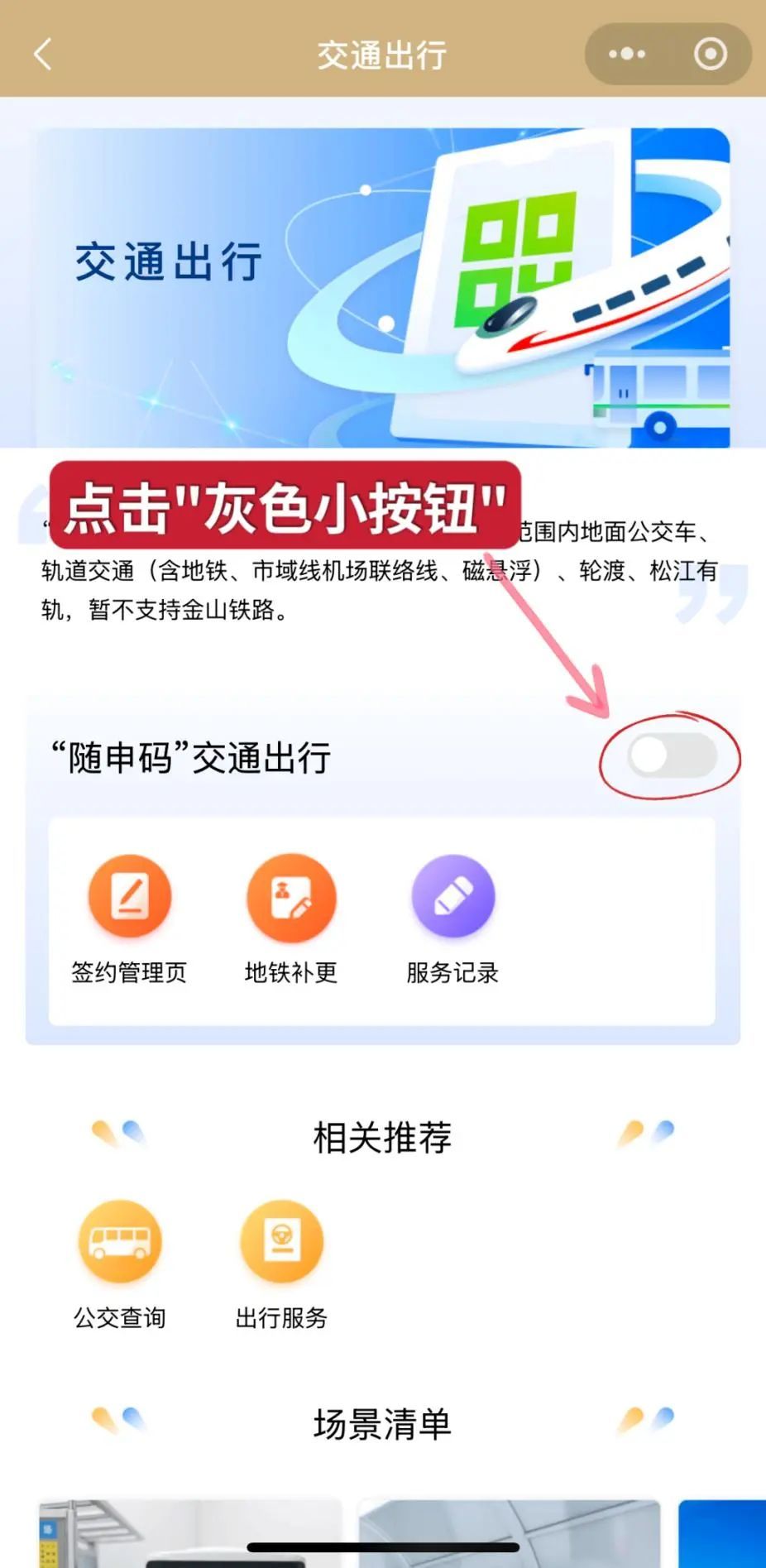 开通后,在“随申码场景配置”打开“交通”右边的小按钮完成配置,然后返回到我们的“随申码”页面,即可刷码乘坐交通工具。