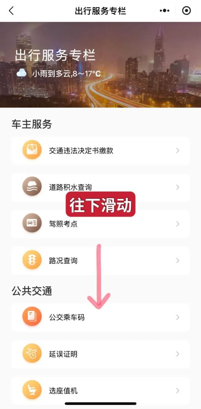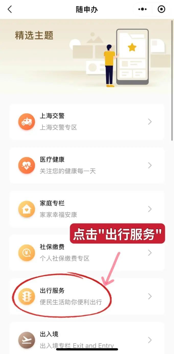 在精选主题该页面点击第五排,跳转至“出行服务”专栏。