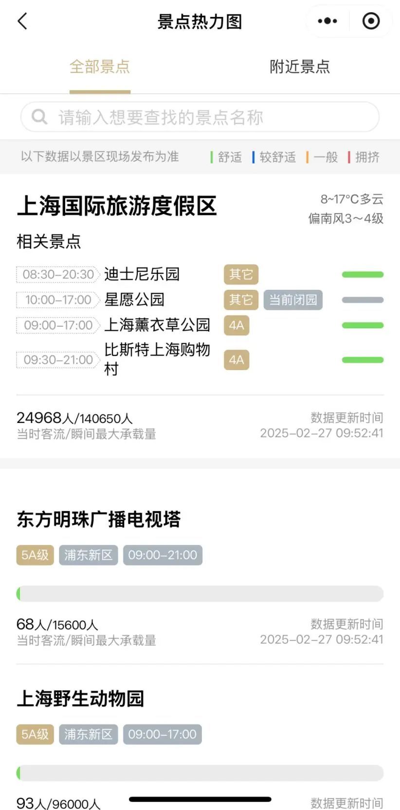 在“景点热力图”板块中,我们便能一览上海所有景点及其周边景点的人流情况和营业时间。