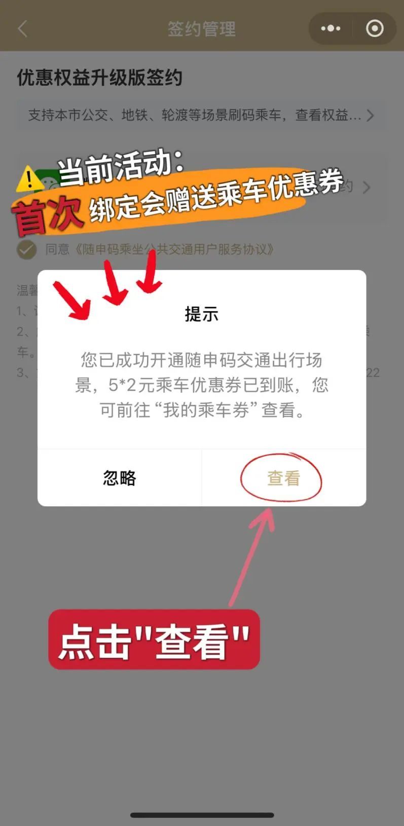 页面弹出“已开通公共交通免密支付”后,点击“完成”,首次绑定会赠送5张2元乘车优惠券,可点击查看。
