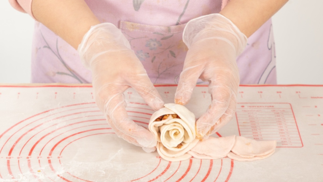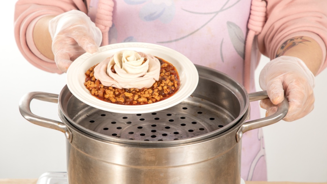 7.将面片对折,由浅到深卷起,注意整理花朵的形状,底层再铺上一层肉酱,上锅蒸20分钟即可出炉。
