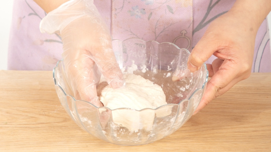 4.面粉加水,搅拌成絮状,用手揉成团,包上保鲜膜醒15分钟,再揉3分钟。