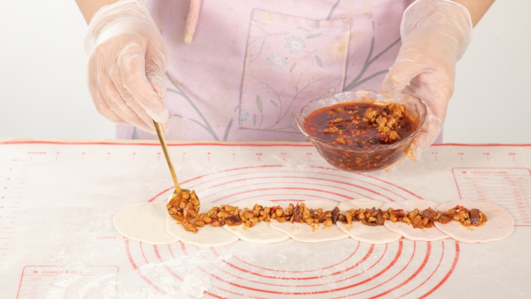 6.将面团擀薄,切成一片一片圆形面片。按照颜色深浅排好,铺一层肉酱。
