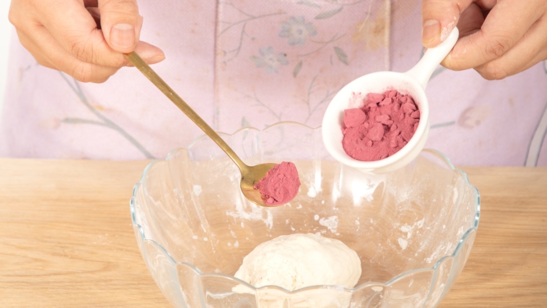 5.加甜菜根粉,将面团调成深粉、浅粉、白色三种颜色的面团。