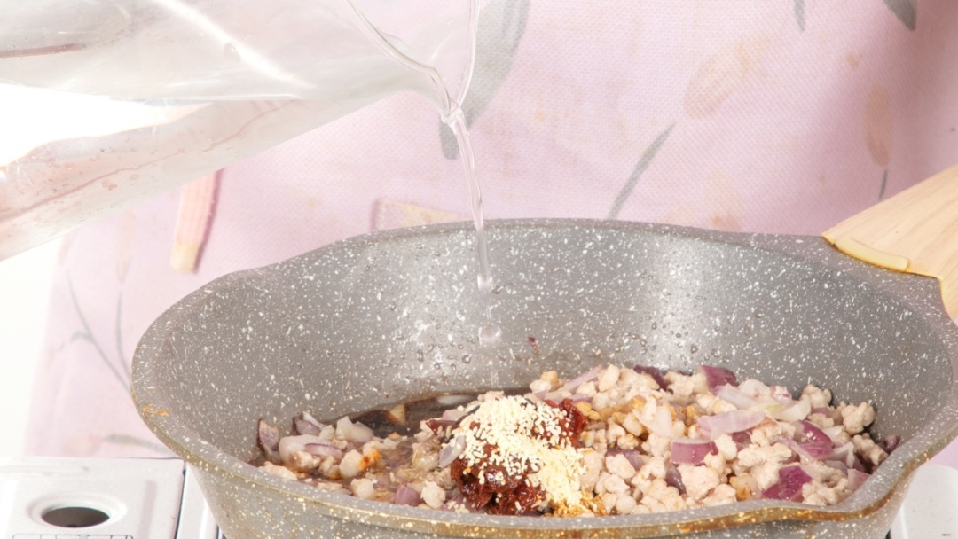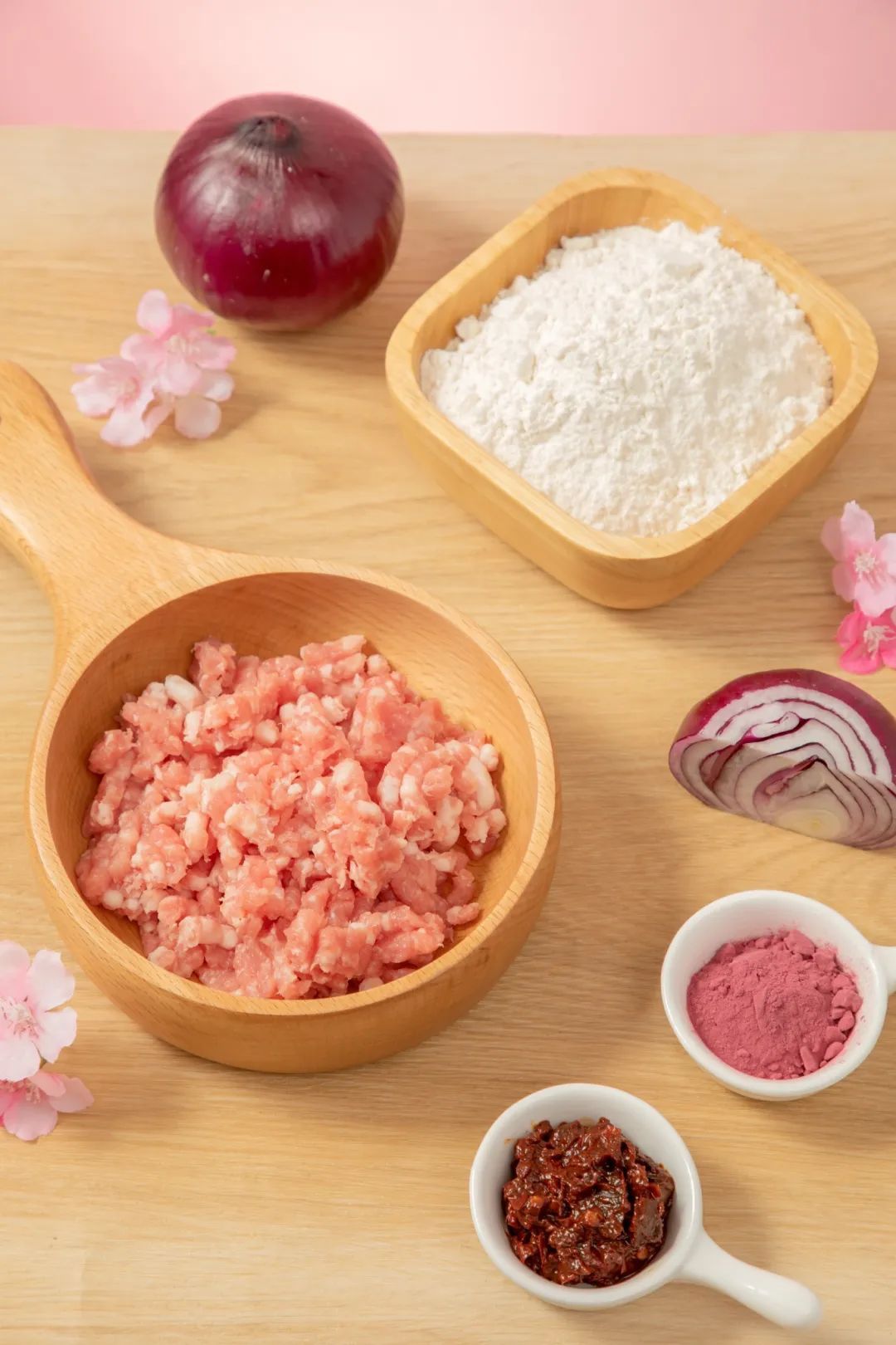 五花肉末150克、面粉200克、洋葱100克、适量鸡精、甜菜根粉、豆瓣酱、蚝油、生抽