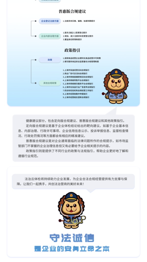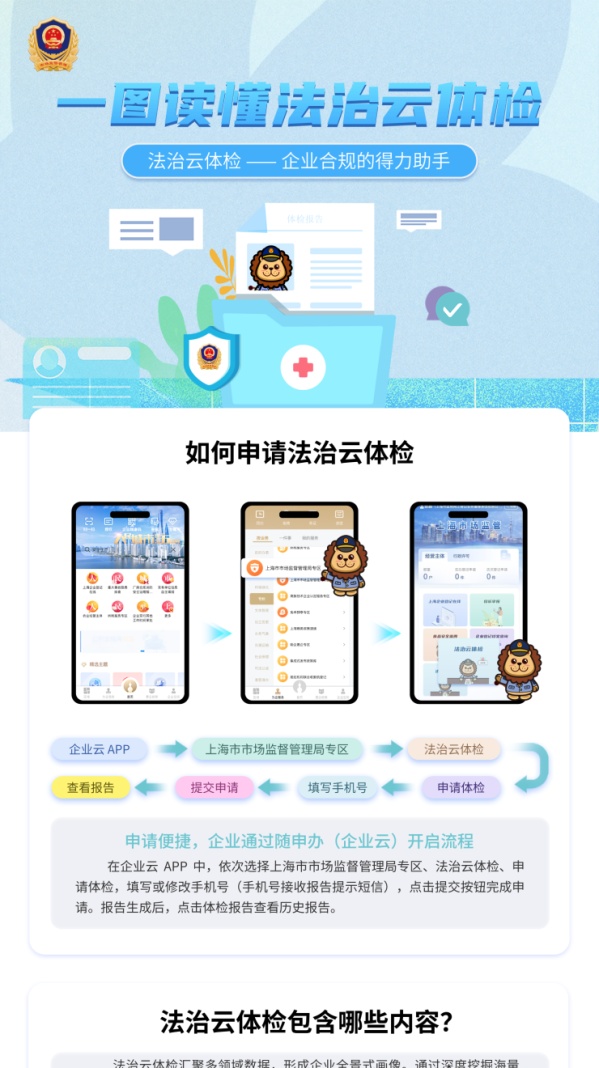 上海市市场监督管理局依托全国市场监管数字化试验区(上海)数据慧治平台,运用“大数据+人工智能”技术,在“随申办企业云”移动端正式上线“法治云体检”服务。