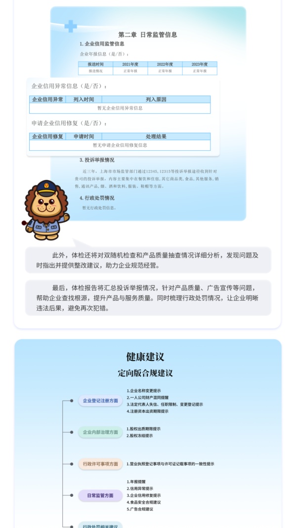 打开“随申办企业云”,点击进入“市场监管专区”“法治云体检模块”,点击“申请体检”,一次市场监管“法治云体检”就完成了,随即法定代表人就收到一份“法治云体检”报告。“法治云体检”报告分为“体检结论”和“健康建议”两部分。“体检结论”涵盖企业基本信息、日常监管信息,全面展示企业的法治“画像”。“健康建议”则包括“定向版”、“普惠版”和“政策指引”三大项内容。其中,定向版合规建议根据企业具体情况提供“靶向”指导,如企业名称变更提醒、一人公司财产混同提示、许可证到期提醒、年报未按时申报提醒等。普惠版合规建议针对企业常见法律问题给予提示。政策指引提供不同行业的政策法规信息,便利企业高效了解政策、精准匹配政策、快速使用政策。