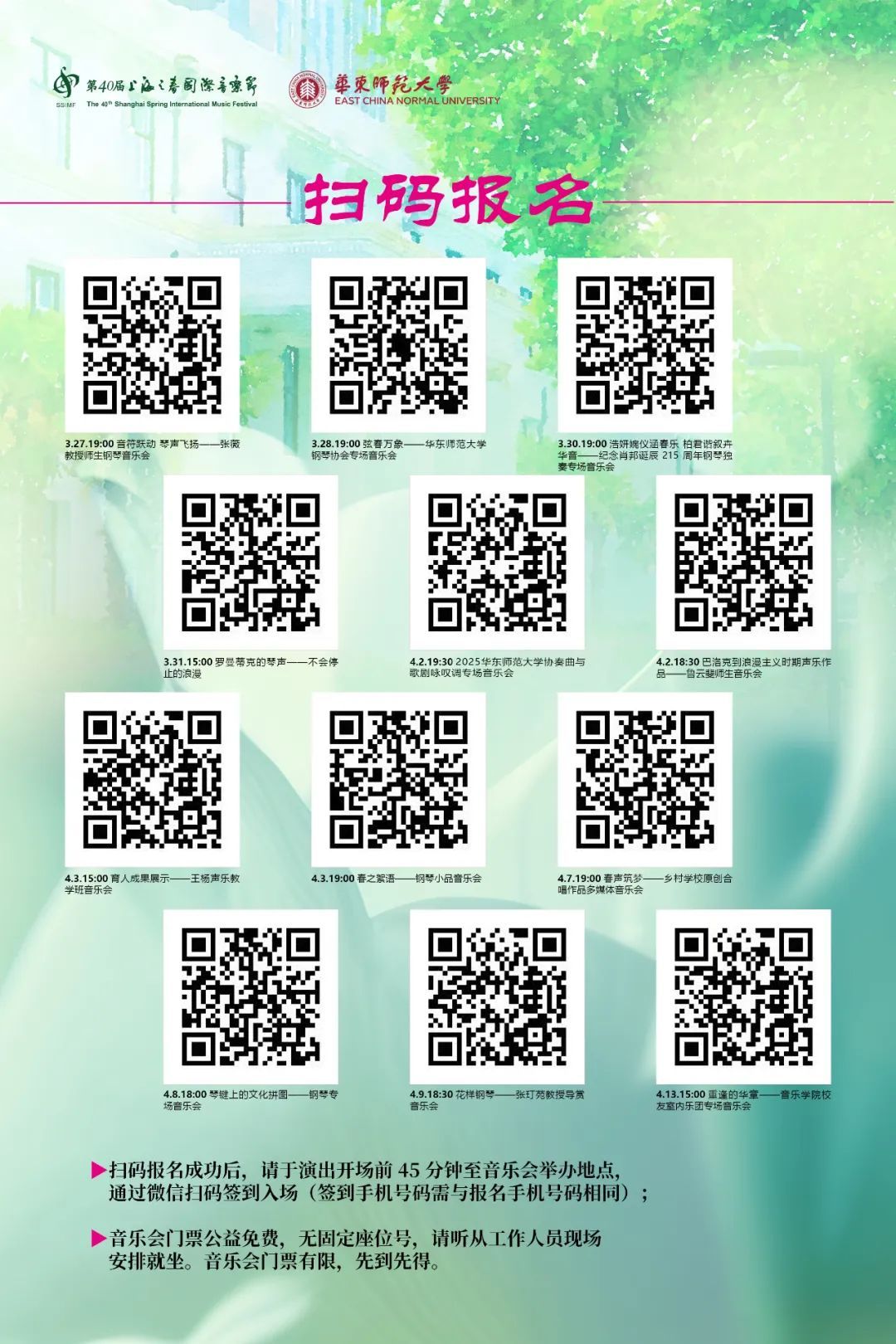 报名成功后,请于演出开场前45分钟至音乐会举办地点,通过微信扫码签到入场(签到手机号需与报名手机号相同)。