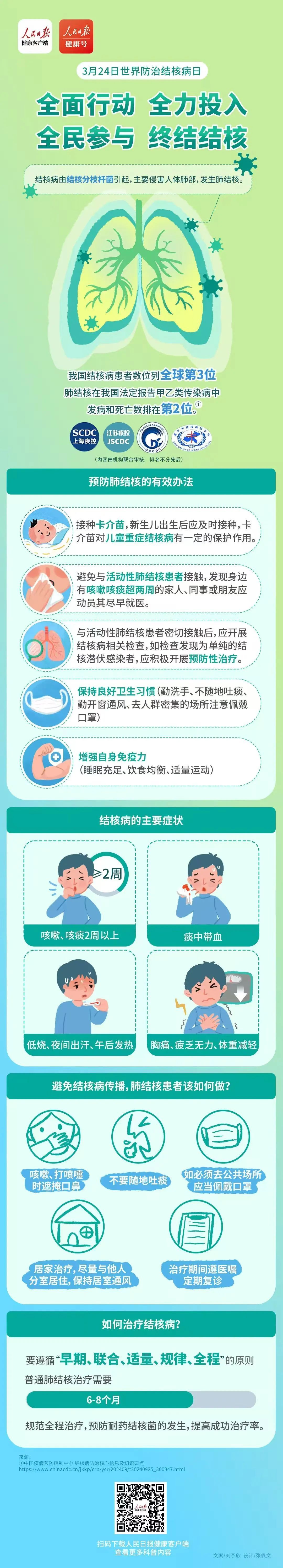 近年来,我市结核病疫情呈现稳步下降趋势,2024年我市报告肺结核发病率为19.2/10万,持续控制在全国最低水平。现推出世界防治结核病日科普海报,全面介绍结核病防治核心信息,帮助公众了解结核病,助力全民结核病防治素养提升。