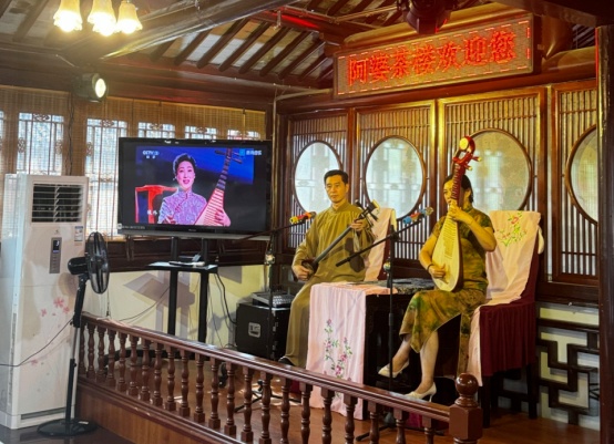 茶楼内共有十多张茶桌,头顶的复古吊扇,茶馆一角的评弹舞台,每桌标配的竹壳热水瓶、玻璃杯和摆放着水果、瓜子、点心的木质茶点盒,都还原了老上海人对茶馆的记忆。