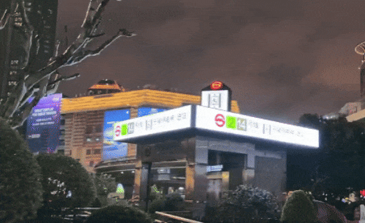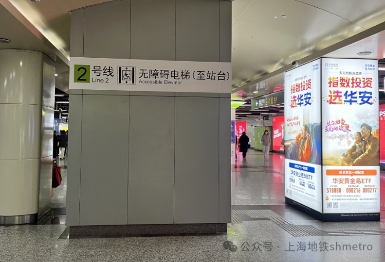 2号口无障碍电梯上方增设环绕灯箱及三角形灯箱,外观更美丽的同时能够使乘客第一时间发现车站无障碍设施。