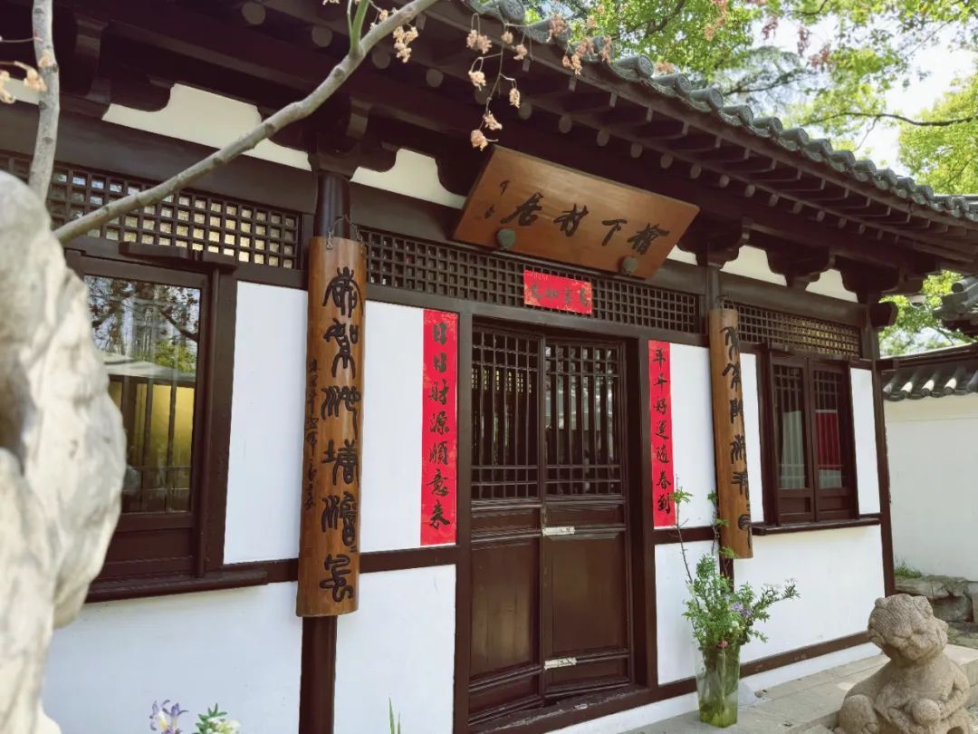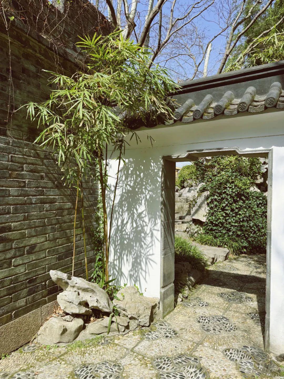 园内半亩池塘,水光返影、绿柳如烟、曲桥浮水,池中小岛古松掩映、怪石峥嵘,岸边粉墙翠竹、鉴亭凌波。