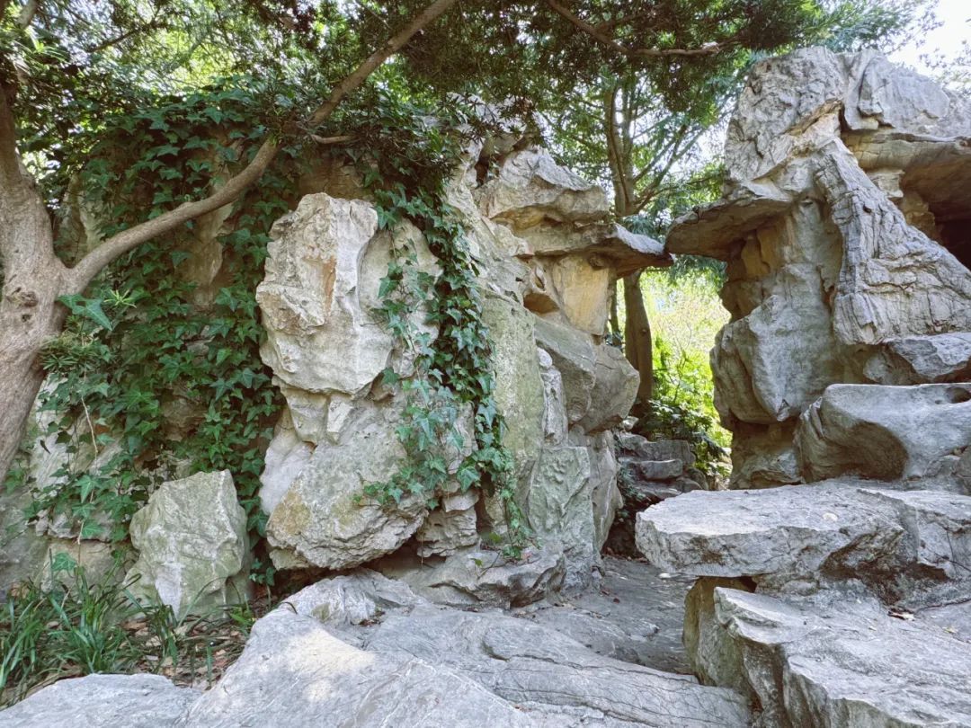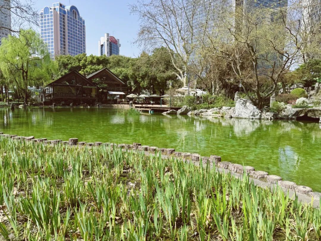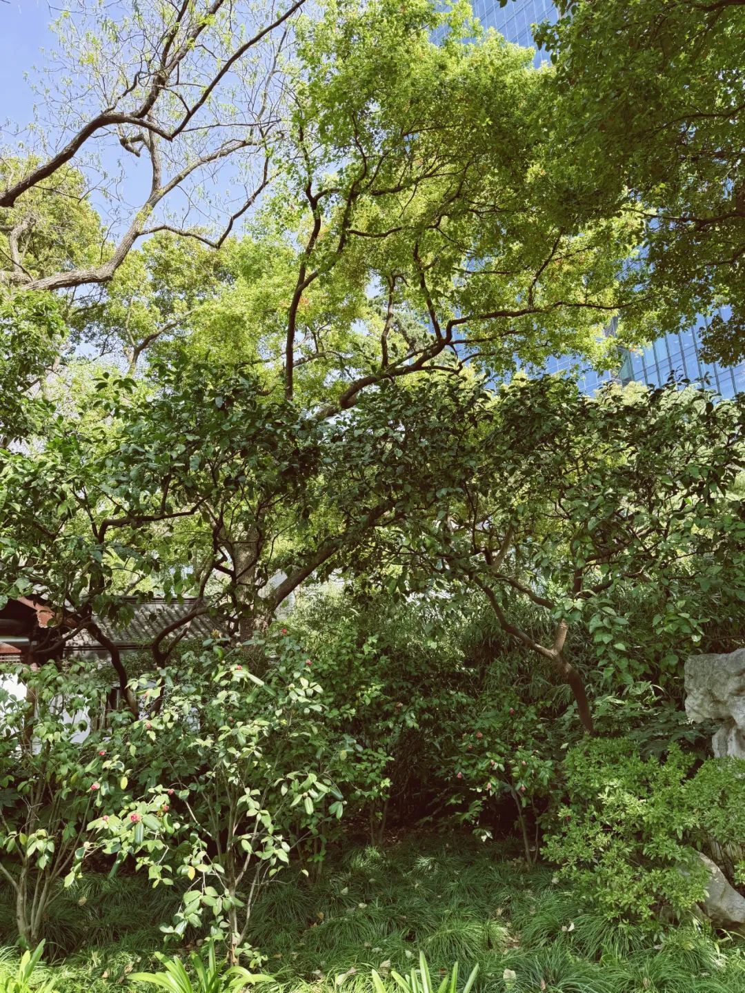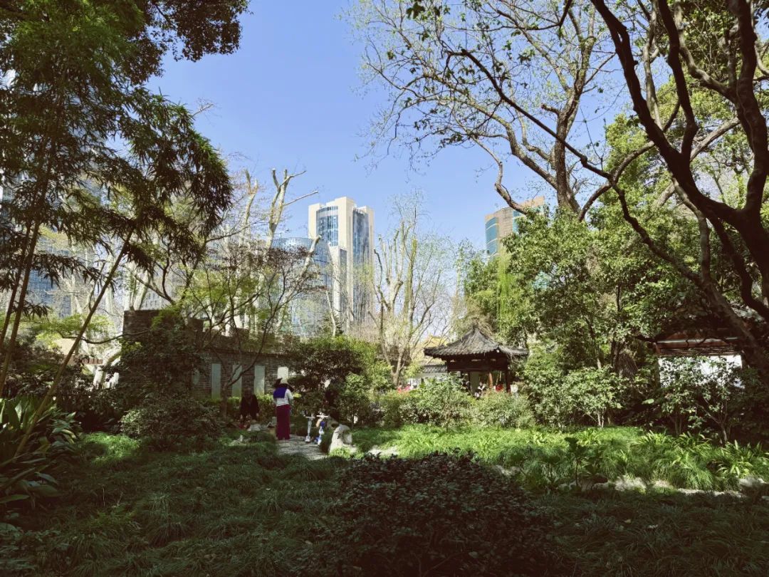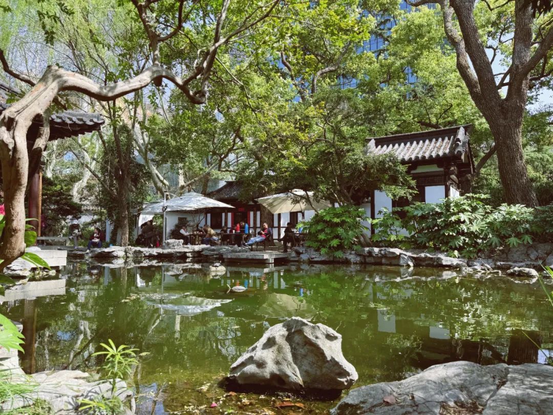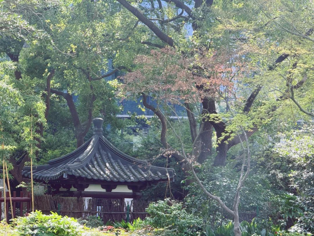 和相对繁华热闹的静安公园相比,由“静安八景”浓缩而成的园中园——八景园,就显得更加静谧一些。抬头望天,刚才还是高楼大厦,一转身便就钻进了绿植掩映的园林之中。