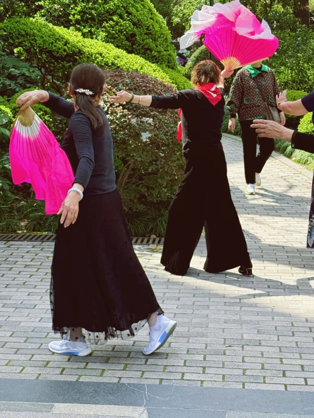 作为附近居民和白领最爱的散步地之一,白天的静安公园格外的热闹与生动。跳舞、体操、舞扇……大家在自己熟悉的“老位子”“老地方”格外放松。