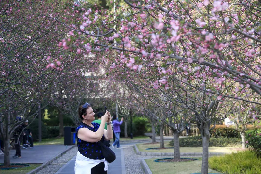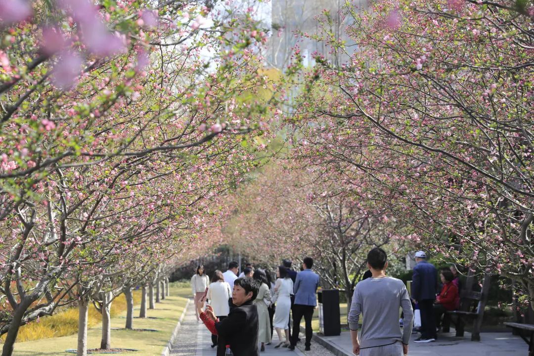 春风拂面,人民公园的海棠苑里,1600余株海棠花正为申城编织出一片梦幻的粉色云霞。