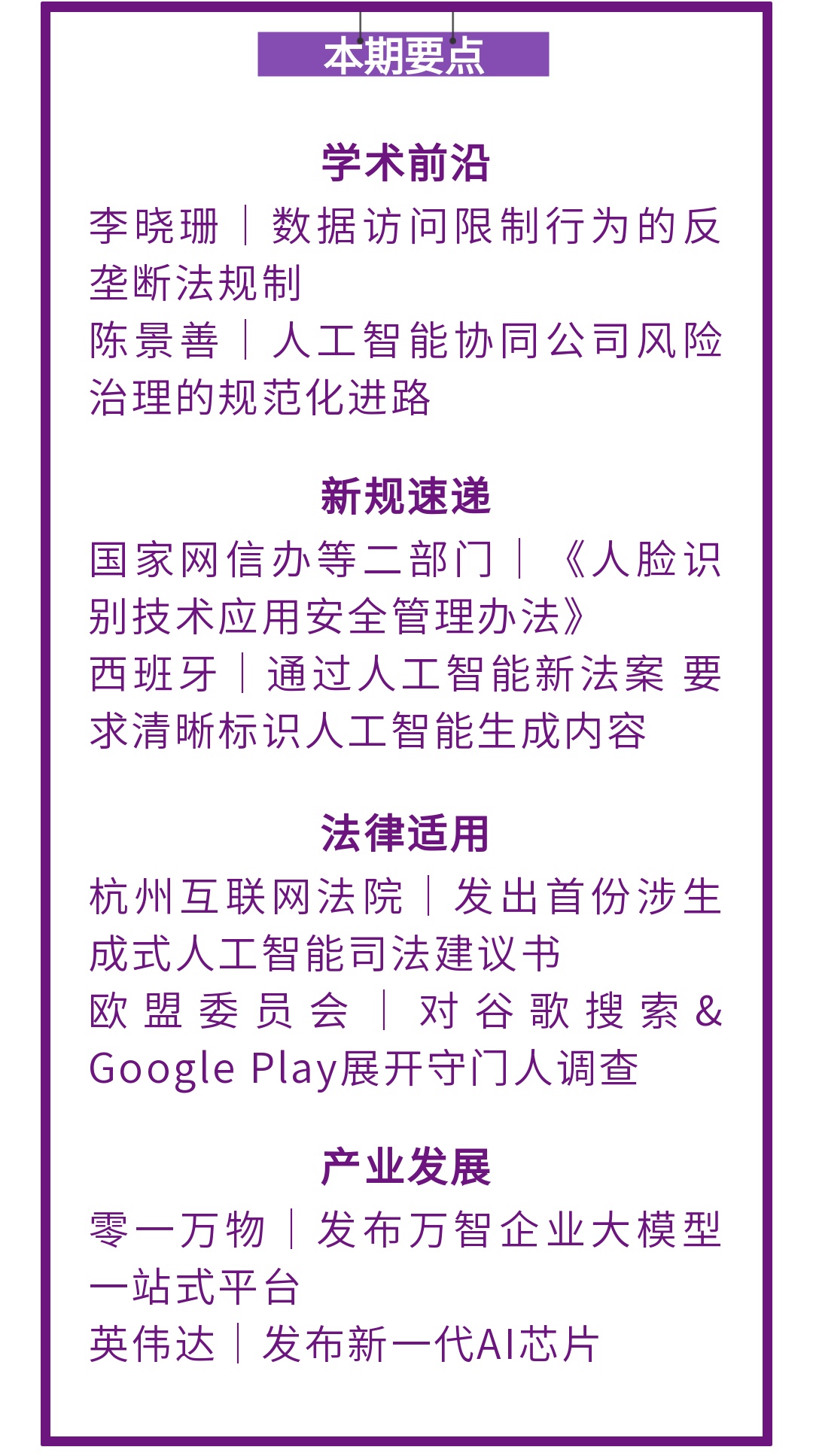 2025年3月21日,国家网信办、公安部联合发布《人脸识别技术应用安全管理办法》,自2025年6月1日起施行。《办法》共二十条,对应用人脸识别技术处理人脸信息的基本要求和处理规则、人脸识别技术应用安全规范、监督管理职责等作出了规定。《办法》明确,个人信息处理者应当在应用人脸识别技术处理的人脸信息存储数量达到10万人之日起30个工作日内向所在地省级以上网信部门履行备案手续;强调为实现相同目的或者达到同等业务要求,存在其他非人脸识别技术方式的,不得将人脸识别技术作为唯一验证方式。(网信中国)