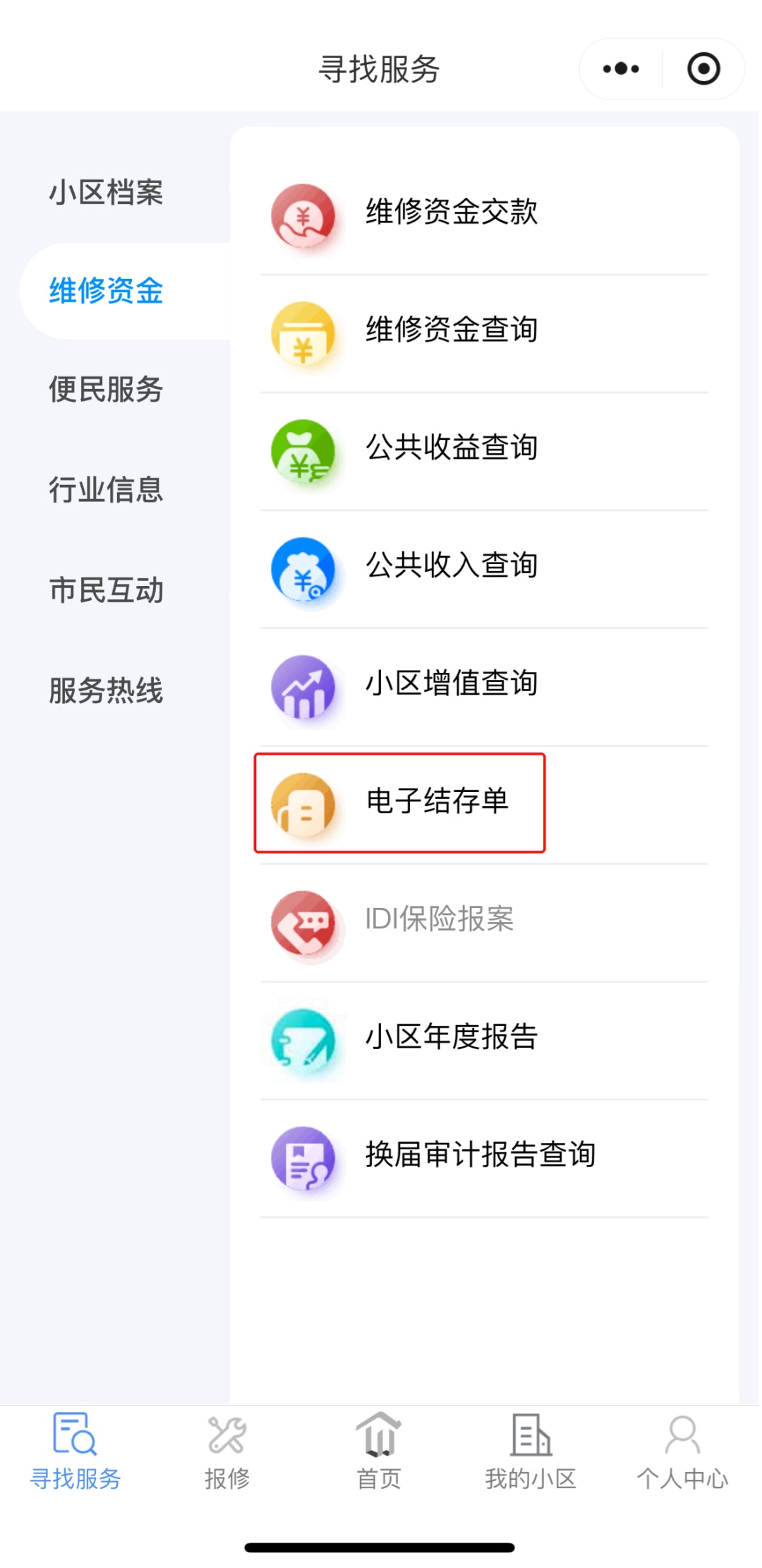 手机APP:首页点击“生活”→“更多”→“生活缴费”→“住房维修资金”,进入电子结存单模块,可查询、下载房屋对应的结存单信息。