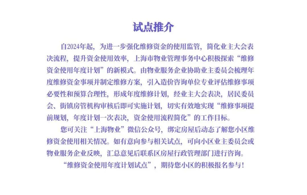 2024年,我们对业主大会自管阶段的商品住宅小区开展了维修资金使用年度计划试点工作。