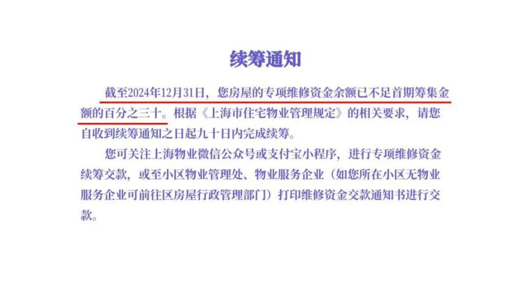 根据《上海市住宅物业管理规定》的相关要求,当维修资金余额不足首期筹集金额的30%时,需要进行续筹。