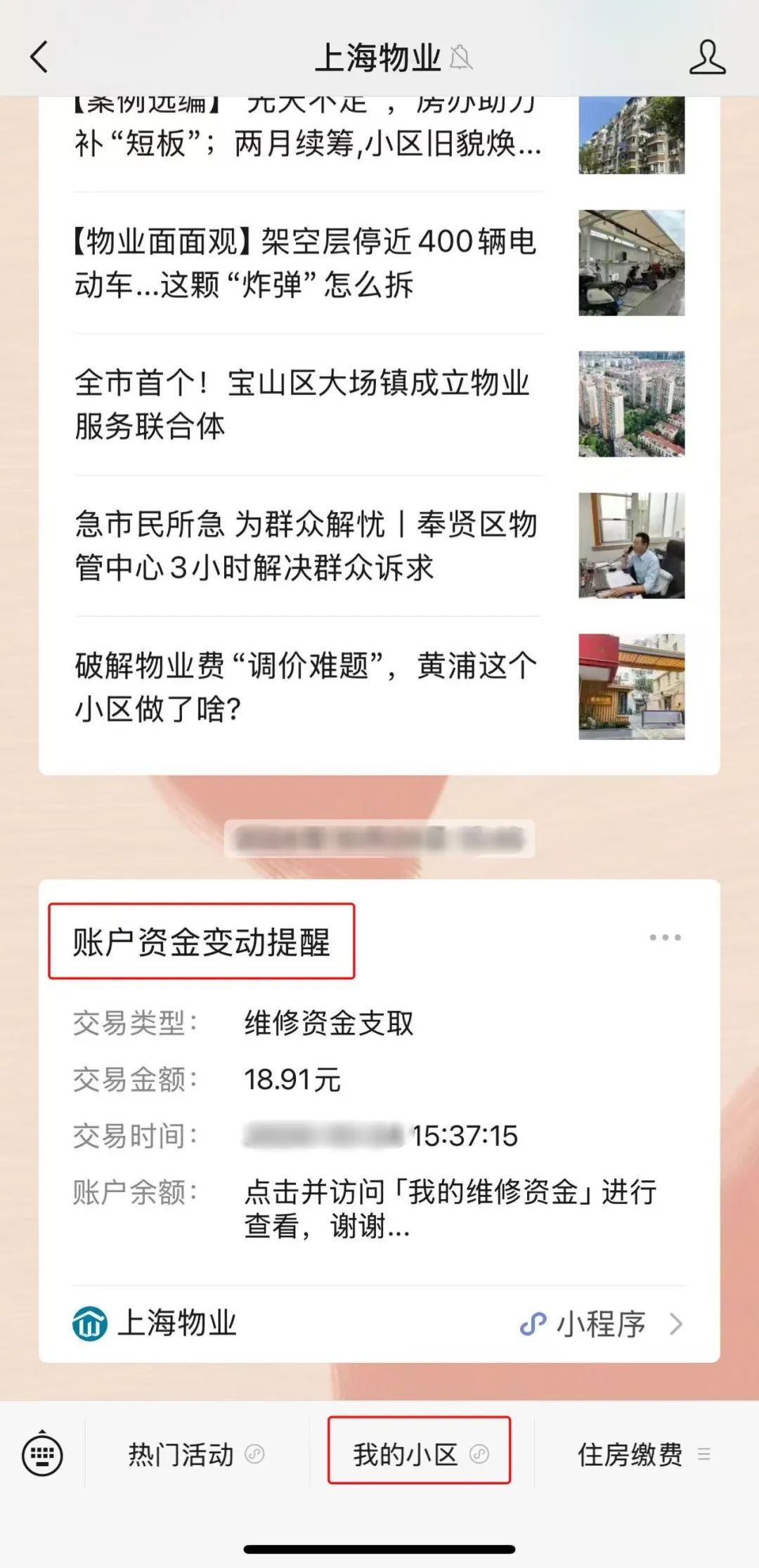 此外,关注“上海物业”微信公众号,绑定房屋信息后,如您的分户维修资金余额发生变动,您将及时收到通知。