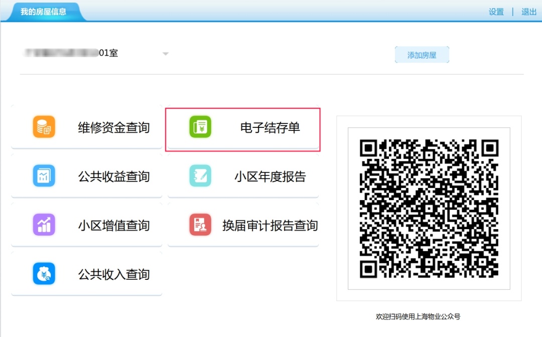 打开“上海物业”微信或支付宝小程序,绑定房屋信息后,可在首页“寻找服务”→“维修资金”→“电子结存单”中查询房屋对应的结存单信息。