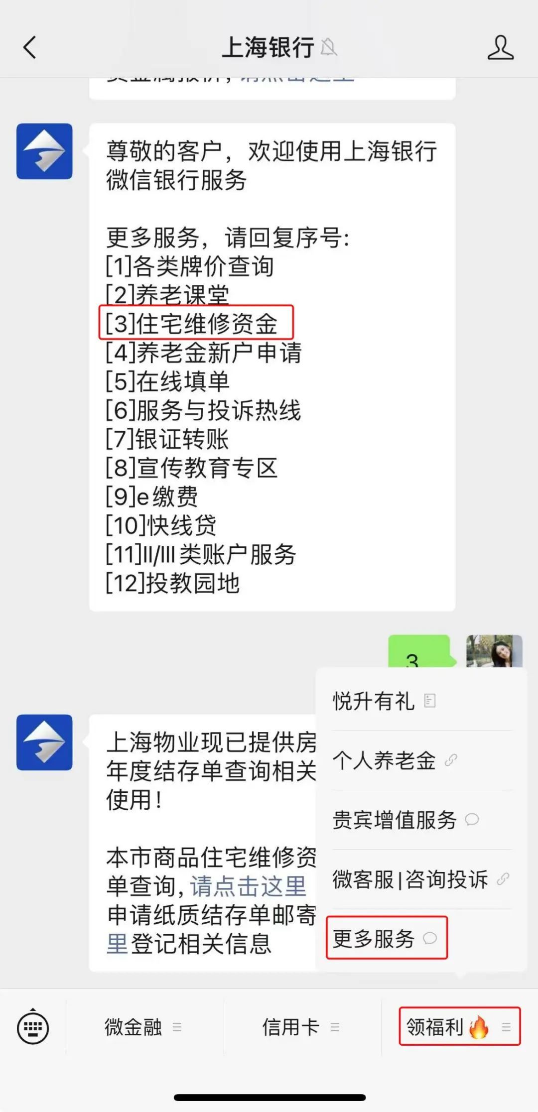 微信公众号:关注“上海银行”微信公众号,点击“领福利”→“更多服务”,回复“住宅维修资金”对应序号,获得电子结存单链接。
