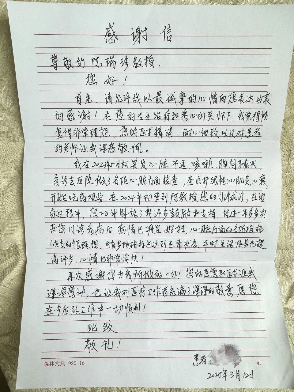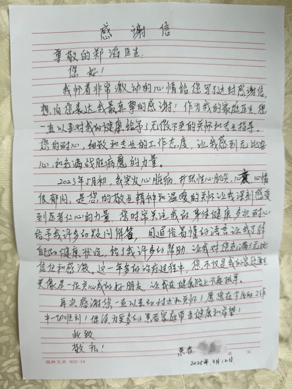 “陈主任、郑医生,谢谢你们!是你们让我重获新生”。近日,奉浦街道社区卫生服务中心上演感人一幕:居民袁阿姨将“医德高尚医术精 关爱病患暖人心”“关怀患者如亲人 耐心负责好医生”两面锦旗,分别送给中山医院心内科陈瑞珍主任和家庭医生郑滔,两封手写的表扬信,更是揭开了这场跨越一年,师徒持续接力,解开袁阿姨的“心结”的暖心故事。 温暖接力,织密健康守护网 奉浦街道社区卫生服务中心积极响应上级号召,全力提升服务能力,推进分级诊疗,邀请上级医院专家下沉带教。中山医院心内科陈瑞珍主任医师的专病门诊,便是服务升级的生动实践。袁阿姨年纪不大平时也很注重健康,却不明原因突发严重心脏病(扩张型心肌病、心衰),身心备受困扰。陈瑞珍教授凭借精湛医术,让她无需奔波大医院,在家门口就能享受优质诊疗服务;家庭医生郑滔在专家指导下,开启长达一年多的规范随访,耐心解答疑问、细致跟进病情,不仅让袁阿姨的各项检查指标逐步好转,更解开了袁阿姨的心结。 专家+家医,健康续航启新程 如今,袁阿姨病情稳定,不仅健康有了保障,更能安心踏上赴国外照顾孙子的旅程。这一场“健康守护战”,见证了社卫中心“双轮驱动”的服务力量——专家下沉提升诊疗水平,家庭医生筑牢健康防线,让居民真正实现“小病不出社区,大病精准转诊”。 奉浦街道社区卫生服务中心始终以“健康”为圆心,以优质服务为半径,不断绘就居民的健康“同心圆”。未来,奉浦社卫将以更精准的医疗服务为支点,以更有温度的健康管理为纽带,持续提升服务能力,让更多居民在家门口收获健康与温暖,感受医疗升级带来的满满幸福感! 奉浦街道社区卫生服务中心 心内科专病介绍 陈瑞珍 主任医师 复旦大学附属 中山医院 擅 长:心肌炎、各类心肌病、心力衰竭、高血压等疾病的诊治。 门诊时间:每月第二个周四下午(需通过家庭医生提前预约) 门诊地点:高州路门诊部(运河北路135号) 李明辉 主治医师 复旦大学附属 中山医院 擅 长:心血管内科疾病临床诊治与基础研究工作,主要研究方向为病毒性心肌炎、扩张型心肌病及心力衰竭的病理生理机制及药物和器械治疗。 门诊时间:每月第四个周四下午(需通过家庭医生提前预约) 门诊地点:高州路门诊部(运河北路135号) 郑 滔 全科副主任医师 奉浦街道社区卫生 服务中心 擅 长:高血压、常见心律失常、心衰等疾病防治。 门诊安排:运河北路135号二楼门诊(每周三);国顺路555号(每周二)