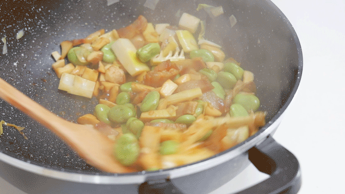 热锅热油翻炒咸肉,待油脂煸出后放入春笋、蚕豆、杏鲍菇一起翻炒至断生,这时便能闻到咸肉香啦!放入适量生抽和盐,根据本帮菜的“提鲜”原则,大家也可以根据喜好放些白糖噢!