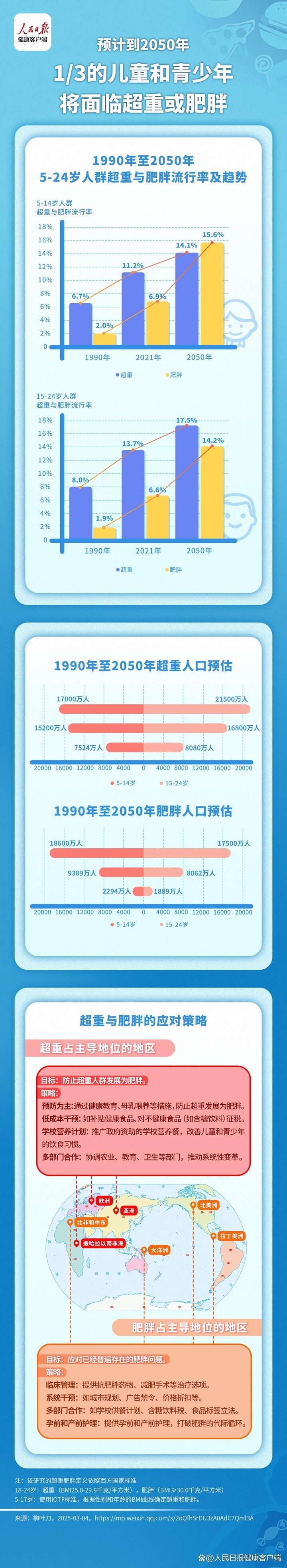 交汇点讯 青少年成长话题已经远远不止于科学素养、学科成绩、代际关系、心理健康、校园交际……日前,当“2050年,预计全球将有1/3青少年儿童面临超重或肥胖”的结论登上国际权威期刊《柳叶刀》后,人们猛然发现问题的严重性。有媒体援引《柳叶刀》这篇文章的内容指出,若不采取紧急政策改革和行动,预计到2050年,全球三分之一的儿童和青少年(5-24岁)约7.46亿人,将直面超重或肥胖的现实。