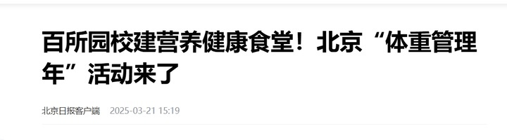 3月21日,北京市“体重管理年”活动实施方案问世,提出北京将在今年组建百人科普专家团队,举办百场体重管理技能讲座,开展百场营养知识进社区活动,并在百所中小学校和幼儿园创建营养健康食堂。