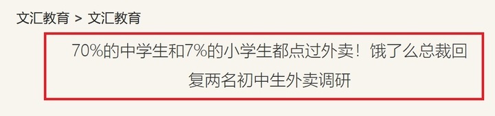 2018年2月12日,文汇报网站旗下的“文汇教育”板块曾刊发一篇报道,标题就是《70%的中学生和7%的小学生都点过外卖!饿了么总裁回复两名初中生外卖调研》。文中提到,基于对1197名中小学生的问卷调查,发现每周叫2-5次外卖的小学生达到8.41%,这一数字在初中生和高中生里,分别达到14.53%和17.78%。甚至还有2.57%的初中生,每天都在叫外卖——这还是在不少家长反对孩子点外卖的情况下发生的。