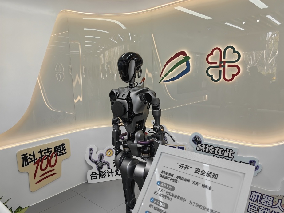 园方为“开开”精心设计了动作互动、趣味问答等功能,不仅增添了互动的趣味性,还极大提升了游客的参与感和沉浸感。据介绍,“开开”平时会在游客服务中心内的指定区域“值守”,为游客答疑解惑,甚至还能做出“比爱心”等动作。而遇到重要活动,“开开”也会行走于公园内,与游客进行互动。