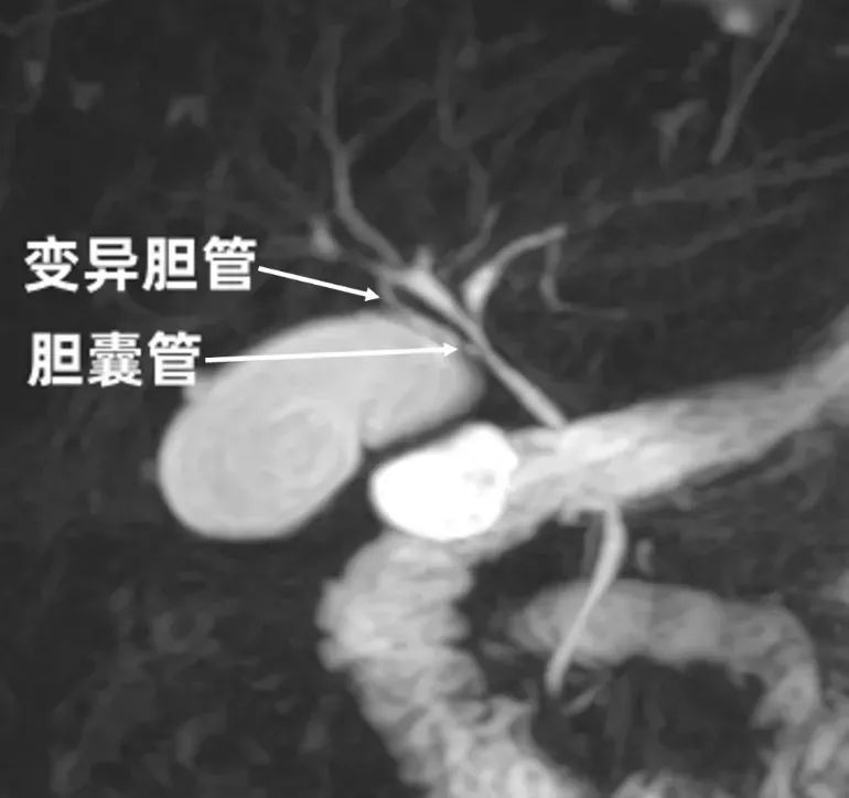 专家团队按常规安排磁共振胰胆管成像(MRCP)检查后意外发现李女士的胆囊有“不同之处”:一根变异的胆管自右后叶胆管发出,通向胆囊,这大大增加了手术的难度。