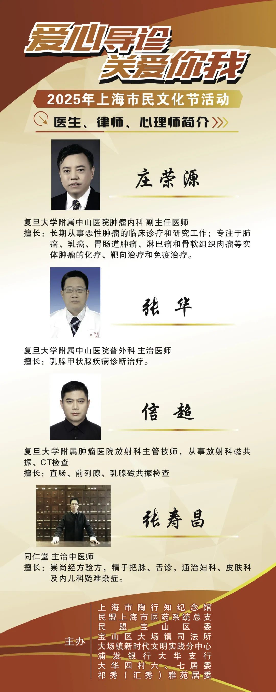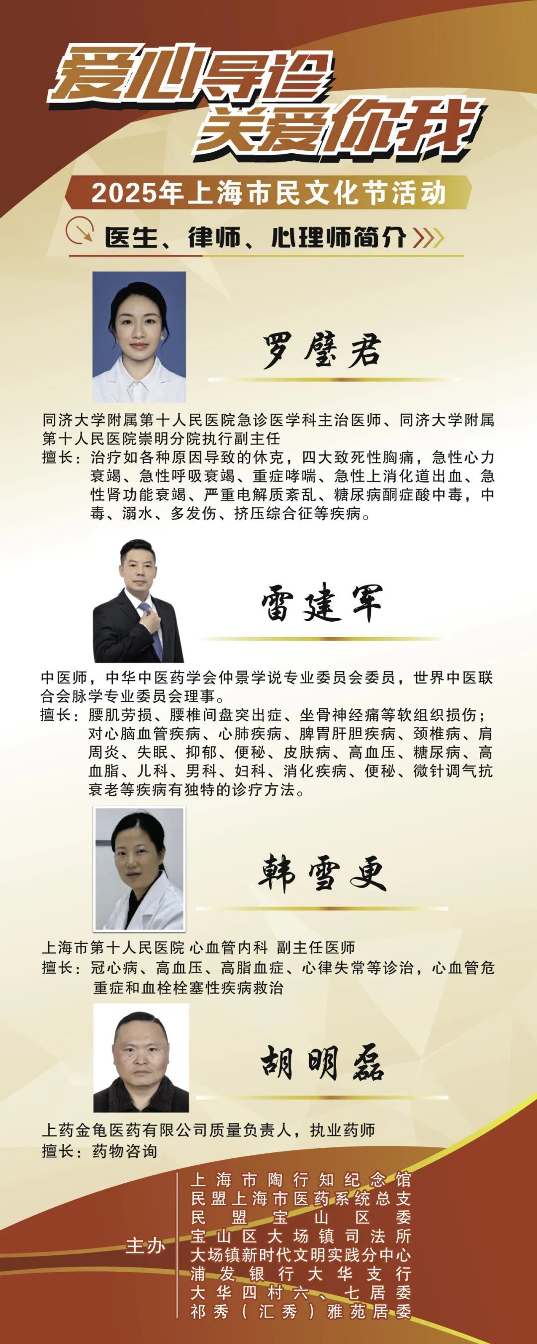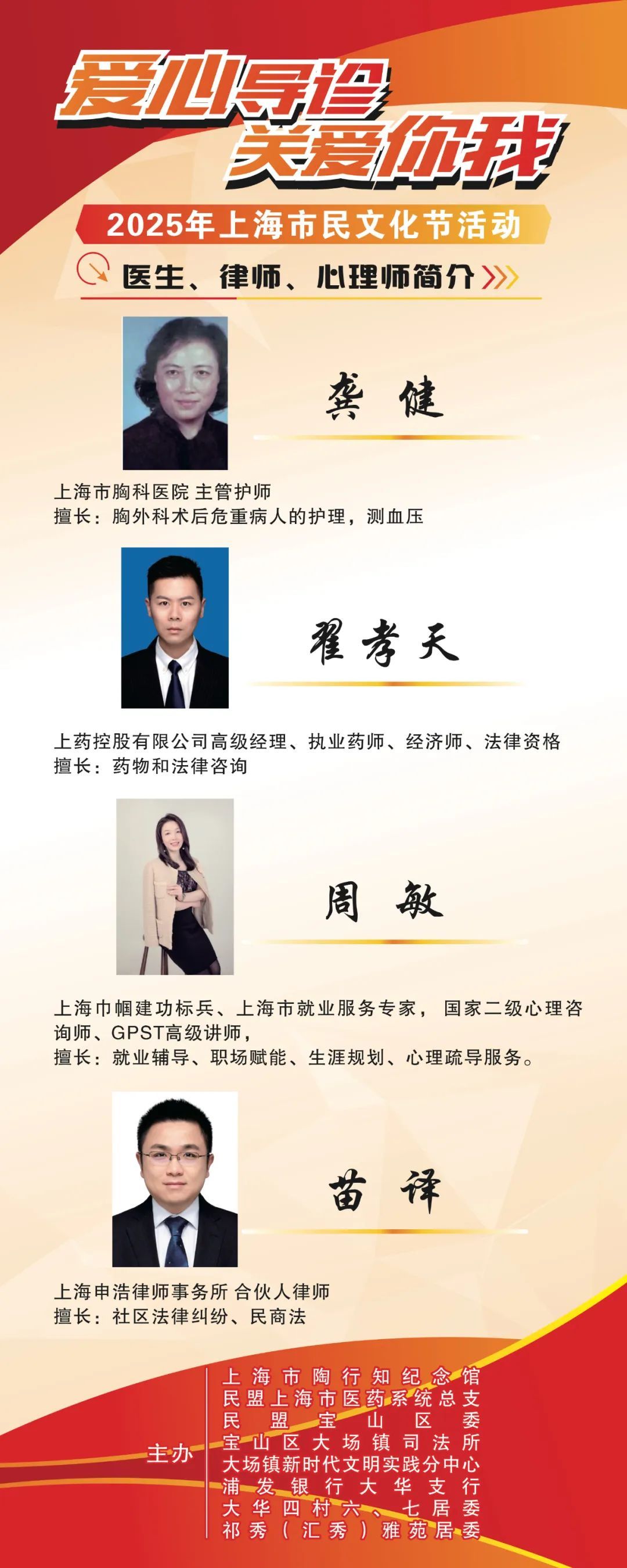 为扎实做好2025年上海市民文化节宝山区专场系列活动,同时深入贯彻落实“人民城市人民建,人民城市为人民”重要理念,并深刻把握雷锋精神的时代内涵,继承发扬老一辈教育工作者“捧着一颗心来,不带半根草去”的高尚品质,不断发展壮大志愿服务队伍,引导更多人乐于服务社会,奉献仁爱之心,解决市民所关心的部分专业医疗问题和丰富医疗知识,增强法律意识,提升心理素养,上海市陶行知纪念馆联合民盟上海市医药系统总支、民盟宝山区委,宝山区大场镇司法所,大场镇新时代文明实践分中心、浦发银行大华支行、大华四村六、七居委,祁秀(汇秀)雅苑居委共同举办第四届“爱心导诊 关爱你我”专场市民医疗义诊、法律和心理咨询志愿服务活动。